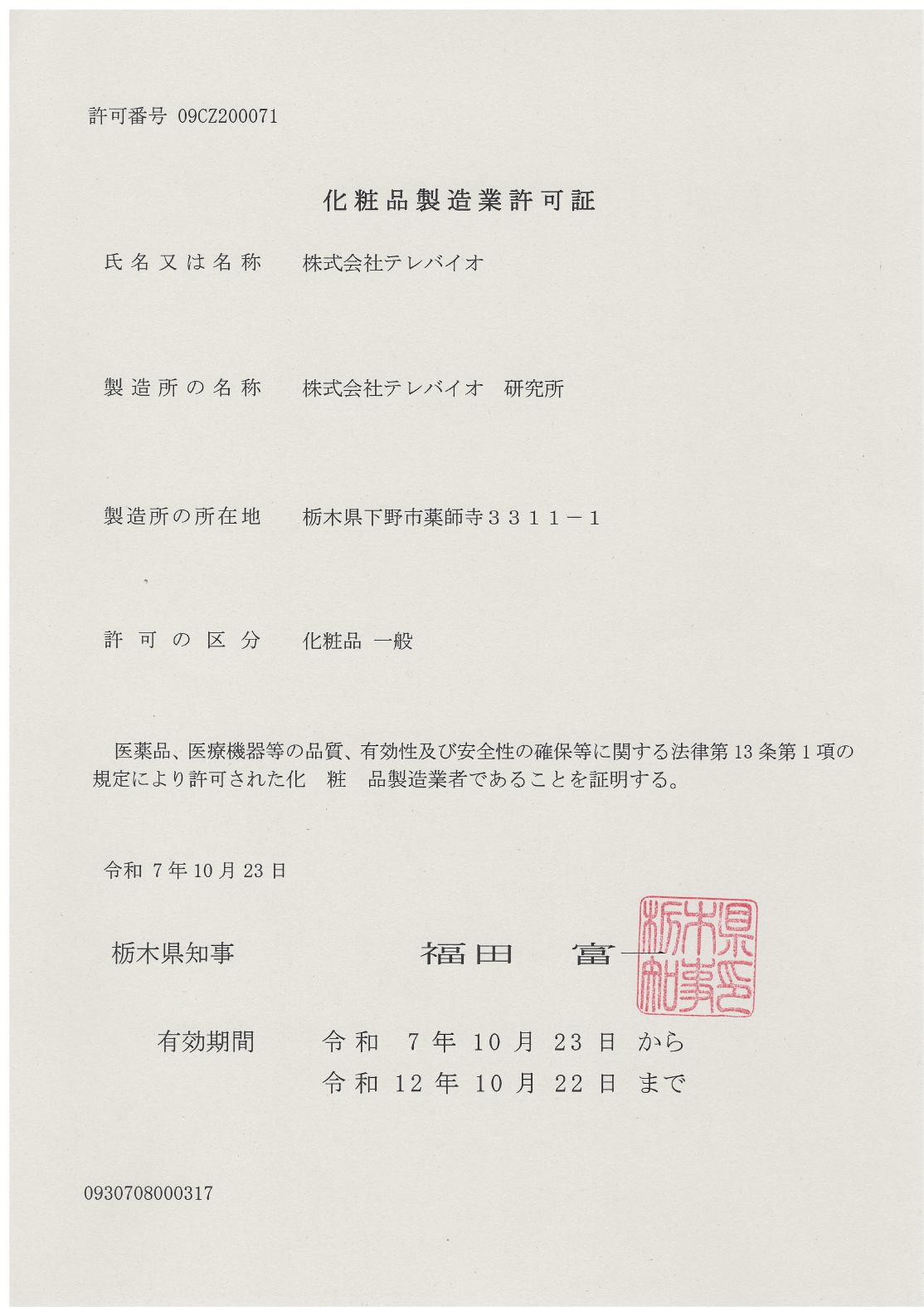 化粧品製造業許可取得のお知らせ