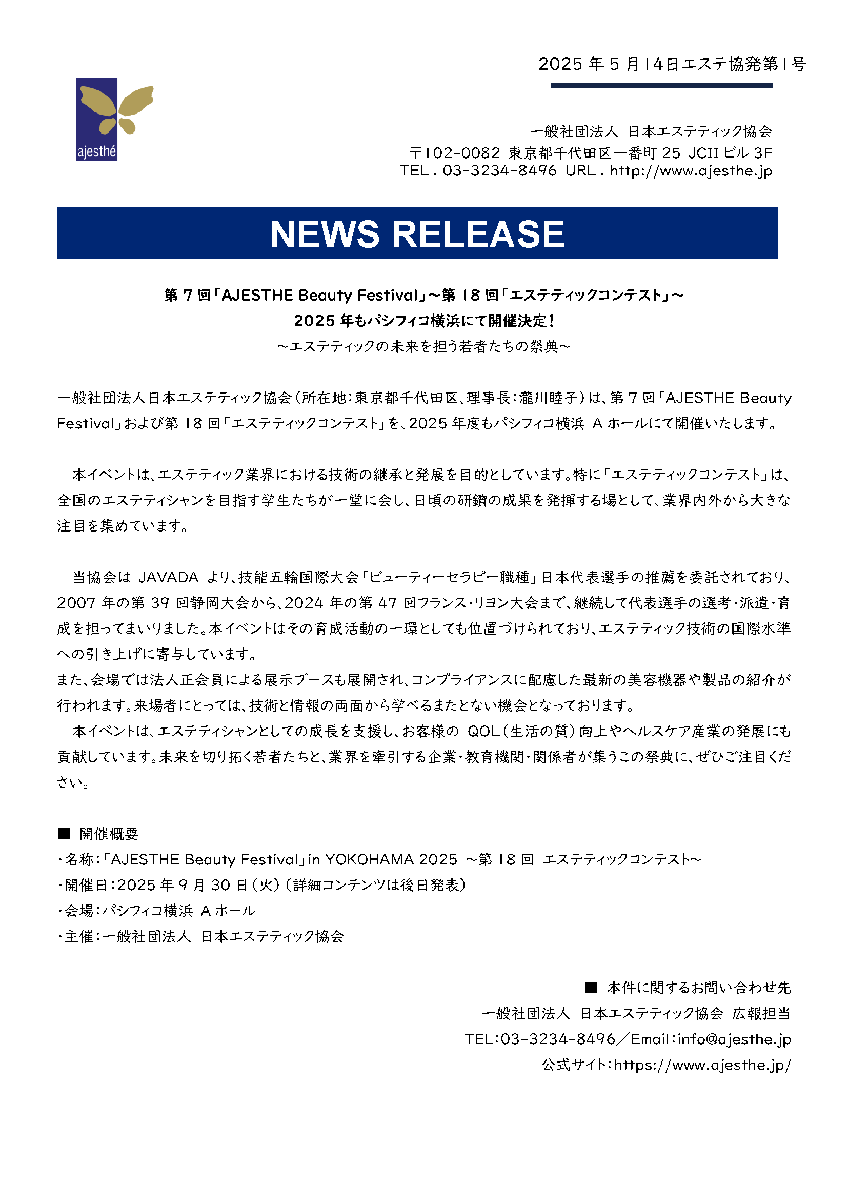 ・名称:「AJESTHE Beauty Festival」in YOKOHAMA 2025 ~第18回 エステティックコンテスト~
