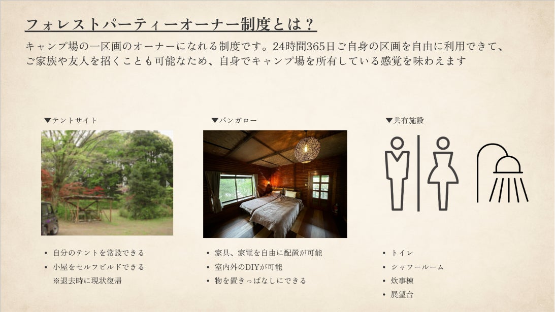 【大人の秘密基地】都心から車で1時間。月額17,800円から区画オーナーになれる会員制キャンプ場「フォレストパーティー峰山」先着10名の初月会費無料キャンペーン実施中!
