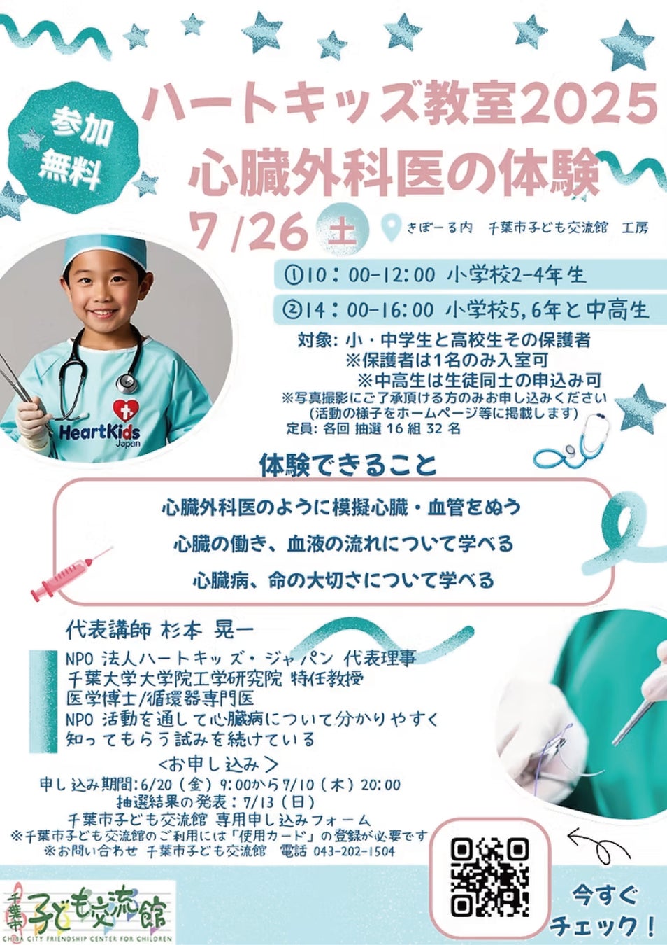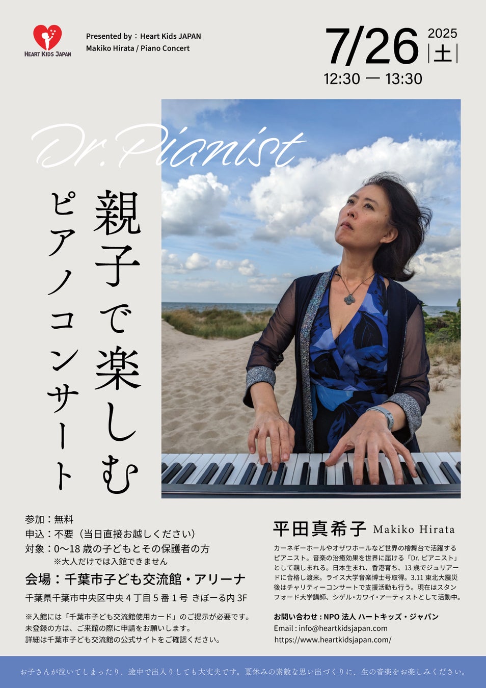 NPO法人ハートキッズ・ジャパンは、2025年7月26日(土)に千葉市こども交流館(千葉県千葉市中央区中央4丁目5番1号 きぼーる内)にて、心臓や血液の流れについて楽しく学べる体験型プログラム「ハートキッズ教室 in 千葉」と、世界で活躍するピアニスト平田真希子氏によるピアノコンサートを同日開催いたします。命の大切さを学び、同時に質の高い音楽に触れる機会を提供することで、夏休み期間中の豊かな学習体験を創出します。