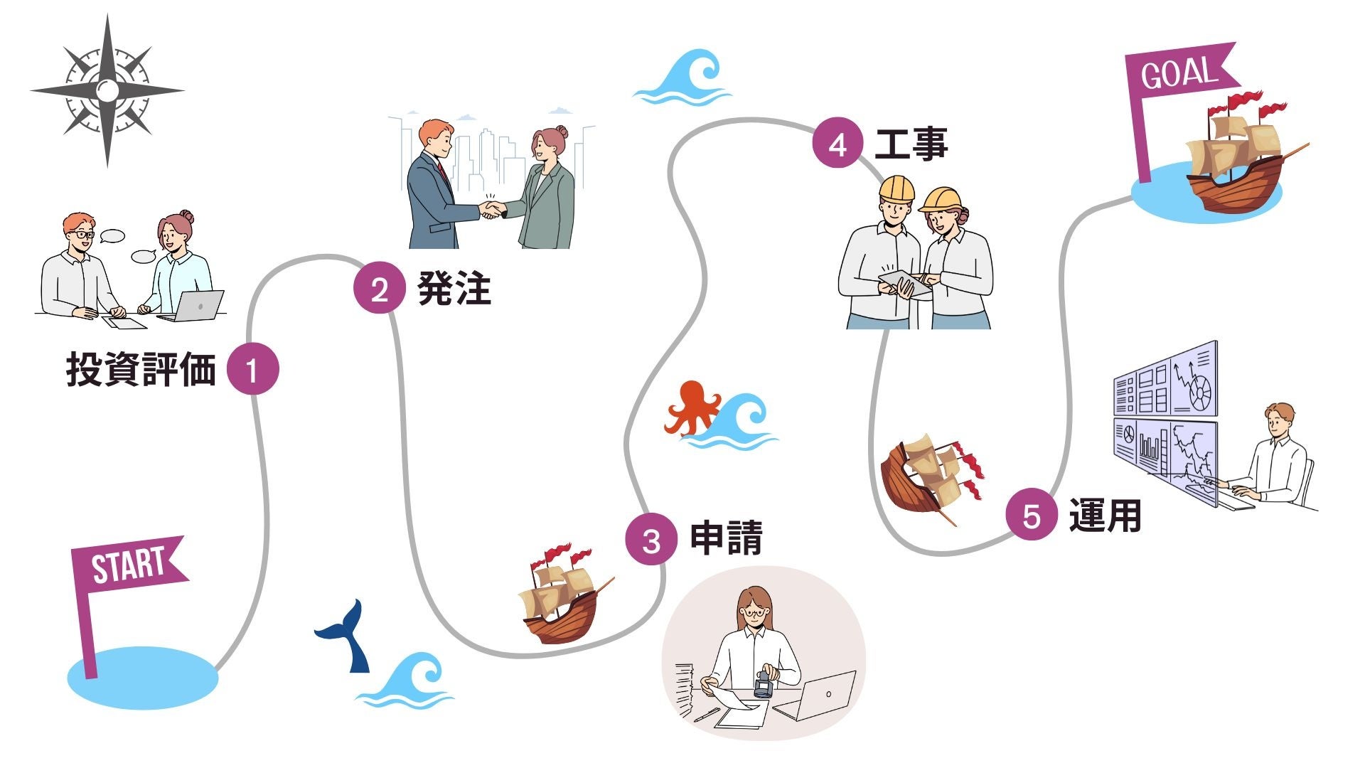 系統用蓄電池ビジネスは、その将来性が期待される一方で、多岐にわたる専門知識と、複雑な制度やプロセスの理解が求められます。グローシップは、数多くのプロジェクトを通して蓄積してきた実務経験を基に、以下の5つのフェーズのコンサルティングを通じて、オーナー企業の事業を確実に「実現」へと導きます。