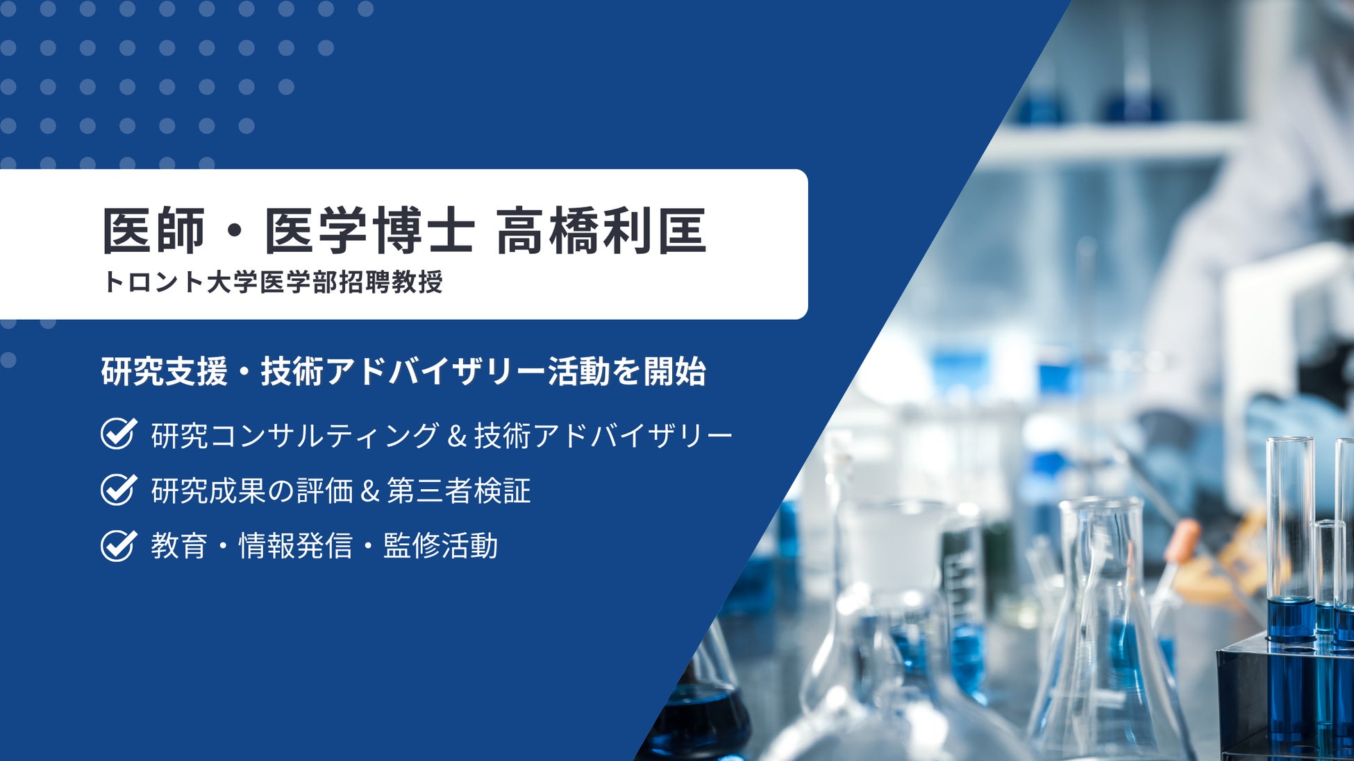 トロント大学医学部の招聘教授であり、老年医学・糖尿病・消化器疾患の専門家として多数の論文・著作を持つ医学博士・高橋利匡(たかはし・としまさ)は、このたび、これまでの研究・臨床経験を社会に還元することを目的に、研究支援・技術アドバイザリー・教育活動などの取り組みを本格的に開始しました。基礎研究と臨床の両方に携わってきた立場を活かし、企業・研究機関・医療現場との連携を通じて、社会課題の解決に貢献していくことを目指します。