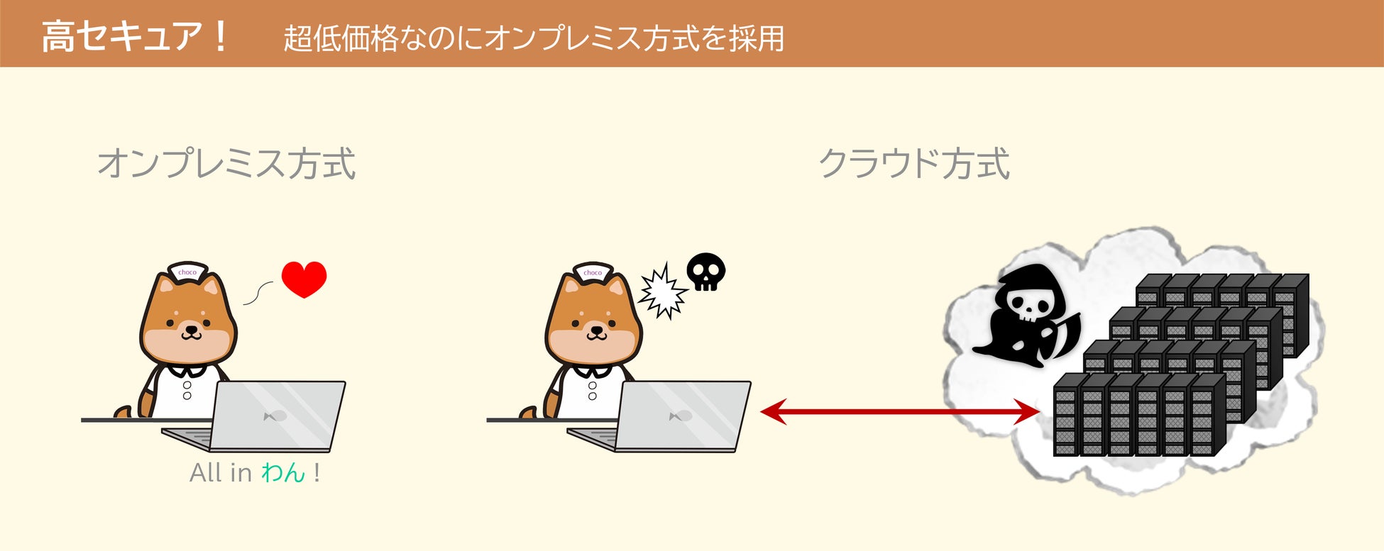 「ちょこ健」は、いわゆる健診システム、つまり、健診・人間ドックを実施する医療機関でご利用いただくための基幹システムです。「健診に特化した電子カルテ」と表現し得るシステムであることから、十分なセキュリティを確保するべく、クラウドを介さない、オンプレミス環境のPC上で動作します。