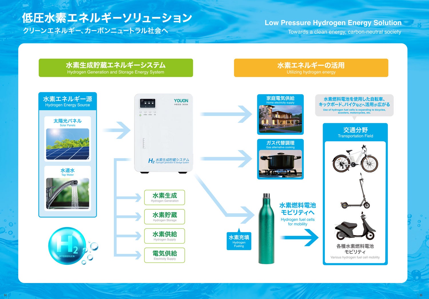 大阪・関西万博は、カーボンニュートラルやSDGs達成を目指す国際的イベントであり、未来社会の姿を具体的に提示する場として位置づけられています。YOUONの水素アシスト自転車および水素生成・充填一体機は、再生可能エネルギー由来の電力によって水から水素を生成し、その水素で走行を支援する次世代モビリティです。