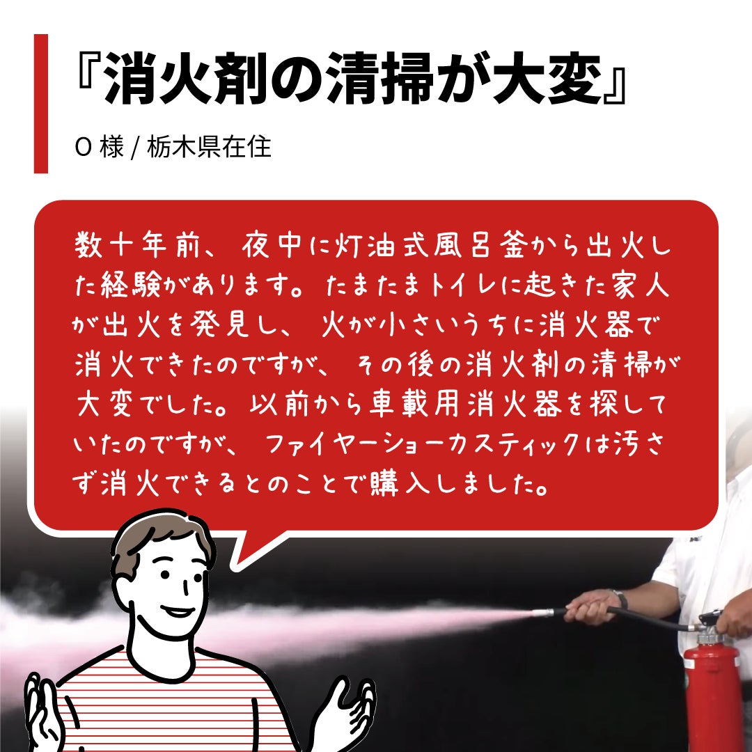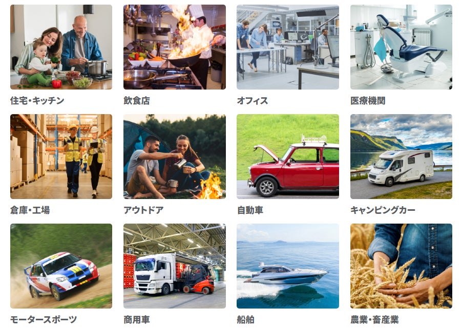ファイヤーショーカスティックは、住宅・キッチン、飲食店、オフィス、医療現場、倉庫・工場、アウトドア、自動車、キャンピングカー、モータースポーツ、商用車、船舶、農業・畜産業など、様々なシーンの初期消火に対応しています。