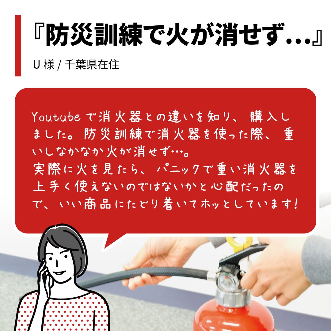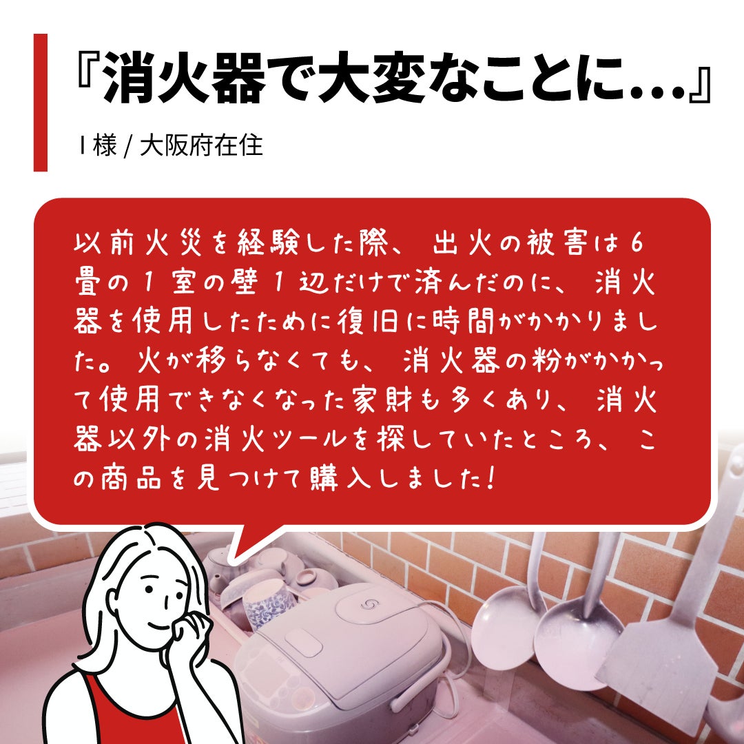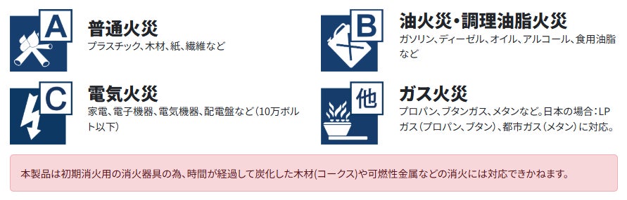 ファイヤーショーカスティックはABC火災(普通火災、油火災・調理油脂火災、電気火災)に加え、一般的な粉末消火器が対応していないガス火災にも対応。火災の種類によって、対応していない消火ツールを誤って使用すると火災を悪化させてしまうリスクがありますが、多くの火災に対応できるためその心配がありません。