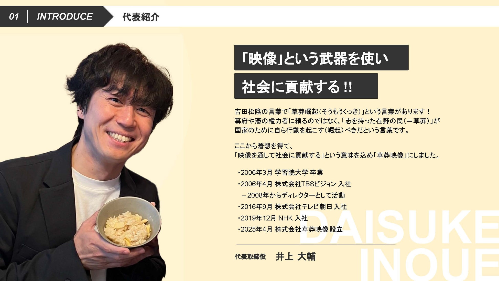 株式会社草莽映像(代表:井上大輔)は、18年間テレビ培った経験やノウハウを使い、様々なステージで映像制作を行います!テレビ番組、YouTubeなどはもちろん、企業PVや社内教育VTRなど、ありとあらゆる映像をハイクオリティに制作します!