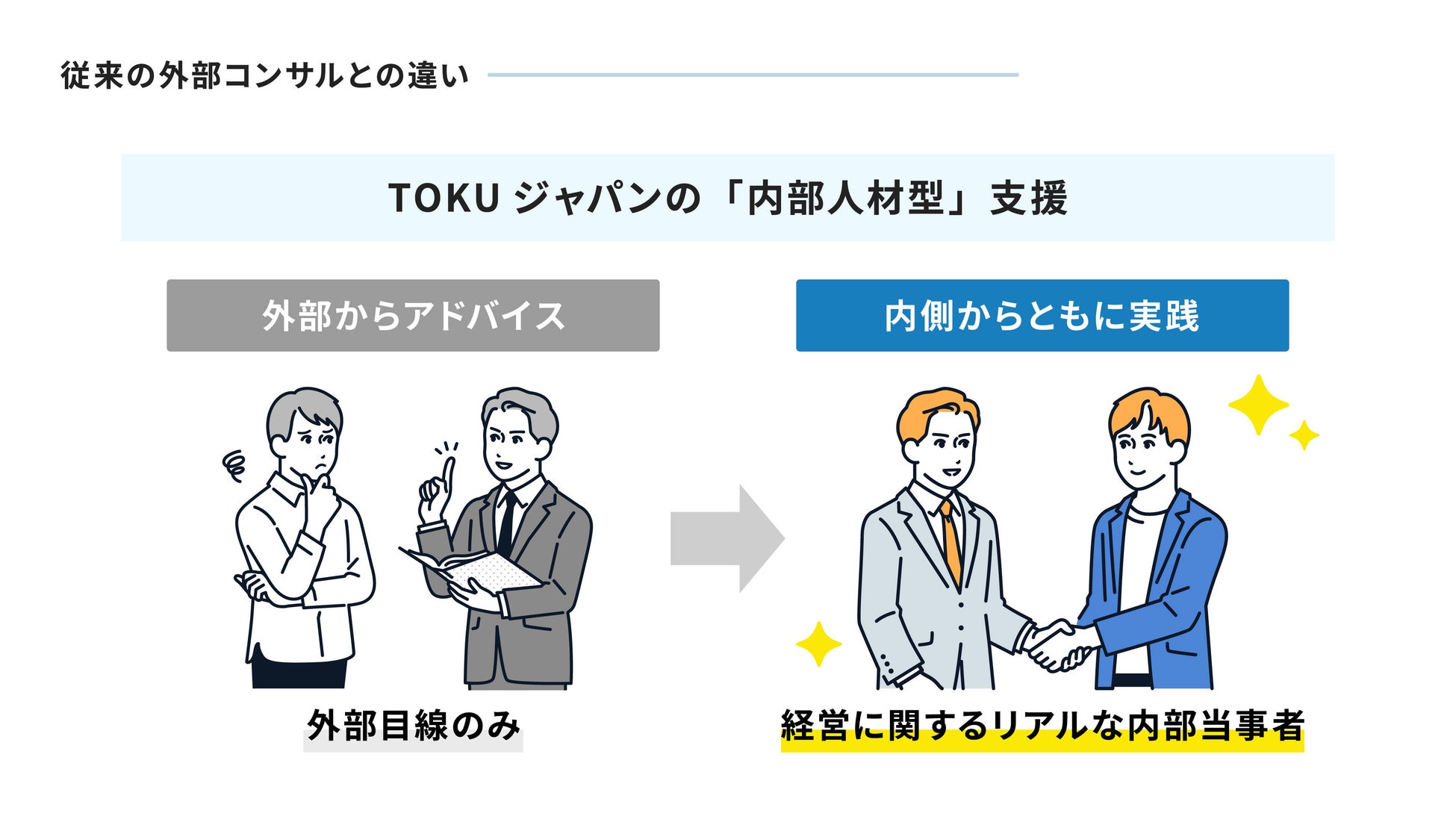 日本には素晴らしい会社がたくさんあり、素晴らしいサービスがたくさんあり、そして素晴らしい社長がたくさんいますが、多額を投じて企業の内外部の経営リソースを活用しても、それらの企業が継続して成長できず、社長自身も悩んでいることを非常に多く見てきました。そのような課題に幾度も直面し、それらを当事者として改革、あるいは立て直していく中で、そのノウハウ・ドゥハウである『TOKUメソッド』が今の弊社の財産になっています。