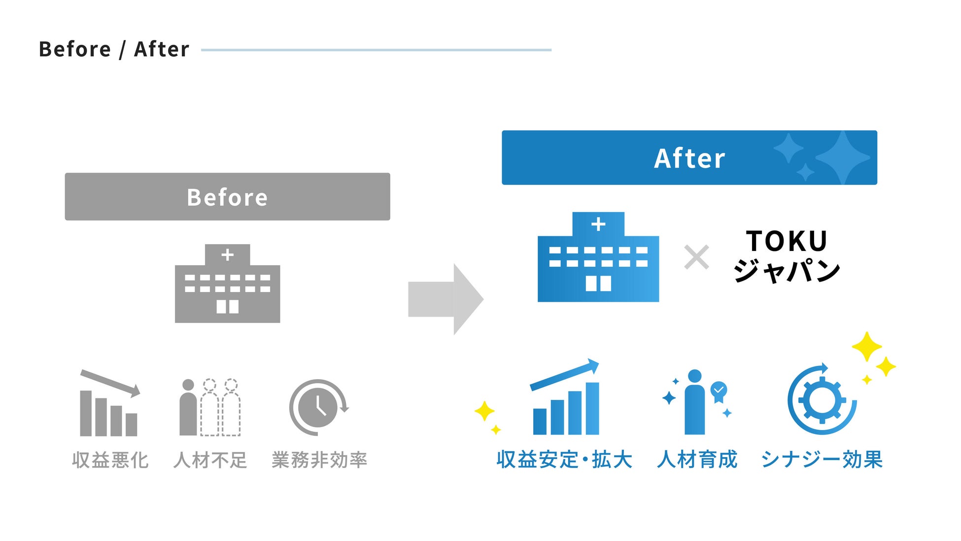 TOKUジャパンは今後、PMI支援サービスを核に、「ヘルスケア・メディカル業界特化型バリューアップ」、「経営人材育成・組織開発特化型支援」など、より専門性の高いサービスも順次展開予定です。企業の永続的発展と、日本経済の活性化に貢献していきます。