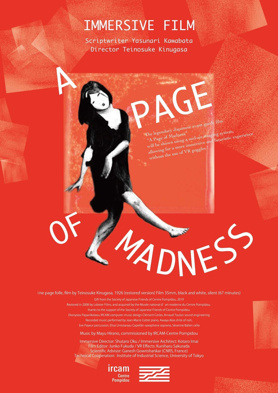 2021年フランス、ポンピドゥーセンター音響・音楽研究所(IRCAM)は、同研究所で学んだ作曲家・平野真結にこの作品の音楽を依頼し、『狂った一頁』に新たな命が吹き込まれました。この新しい『狂った一頁』は、現在開発中の最先端技術「イマーシブ・ディスプレイ」を使用した最初の映画として生まれ変わります。
