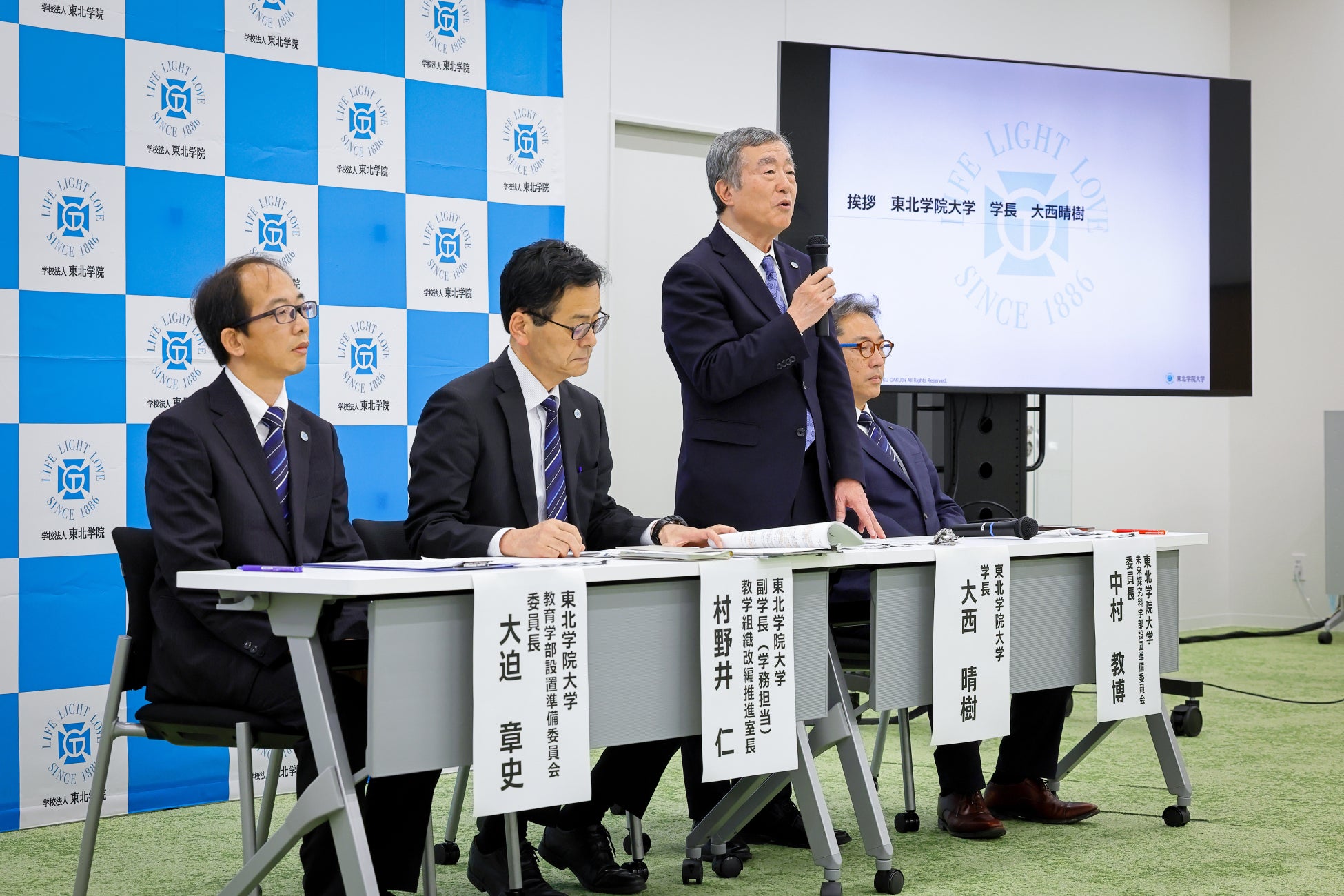 発表会には、東北学院大学学長の大西晴樹、副学長(学務担当)兼教学組織改編推進室長の村野井仁、未来探究科学部(仮称)設置準備委員会委員長の中村教博、教育学部(仮称)設置準備委員会委員長の大迫章史の4名が登壇し、2027年度新設に向けて設置構想中の「未来探究科学部 デジタル構想学科(仮称)」、「教育学部 教育学科(仮称)」を含めた教学組織改編構想の趣旨・概要を説明した。