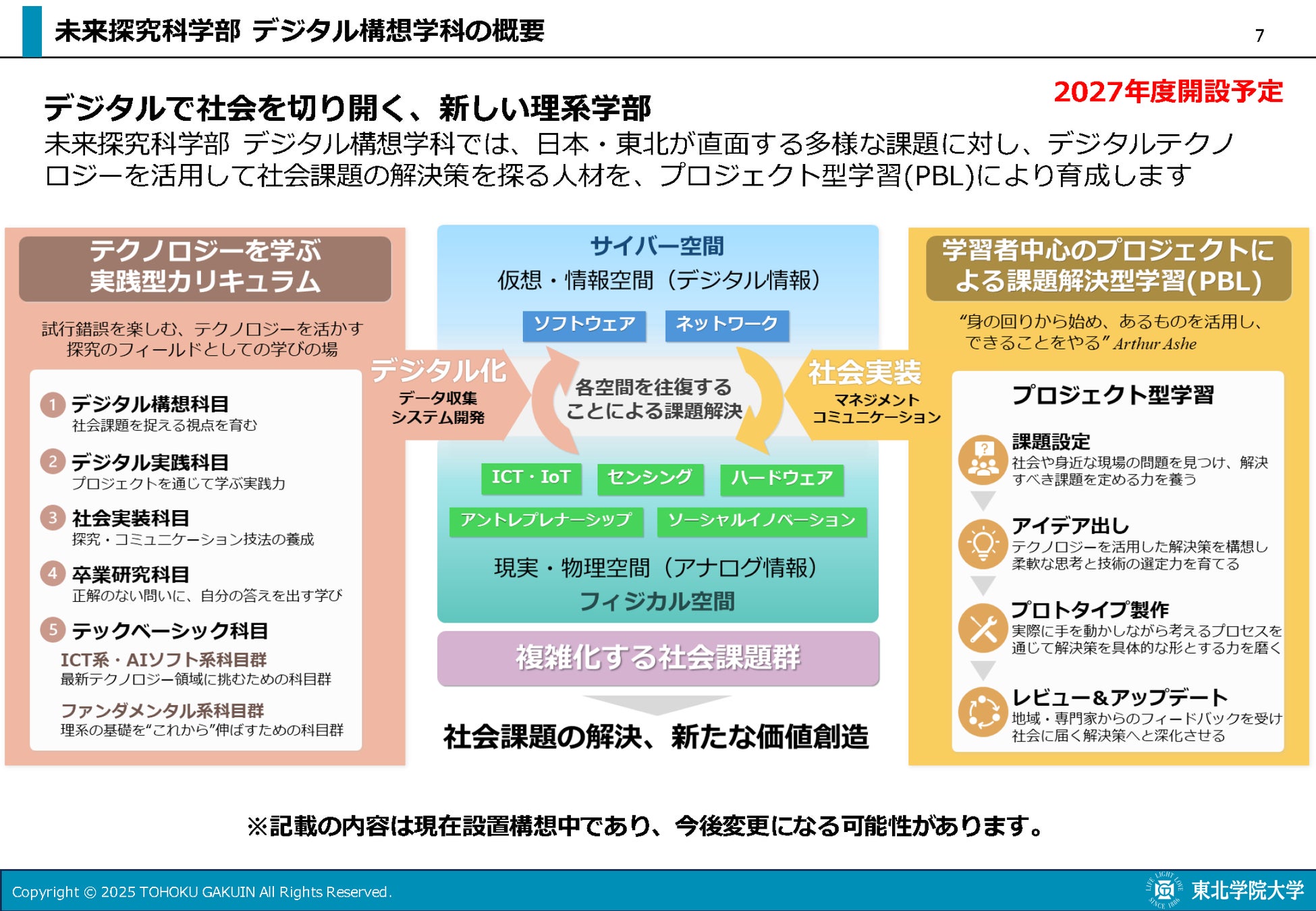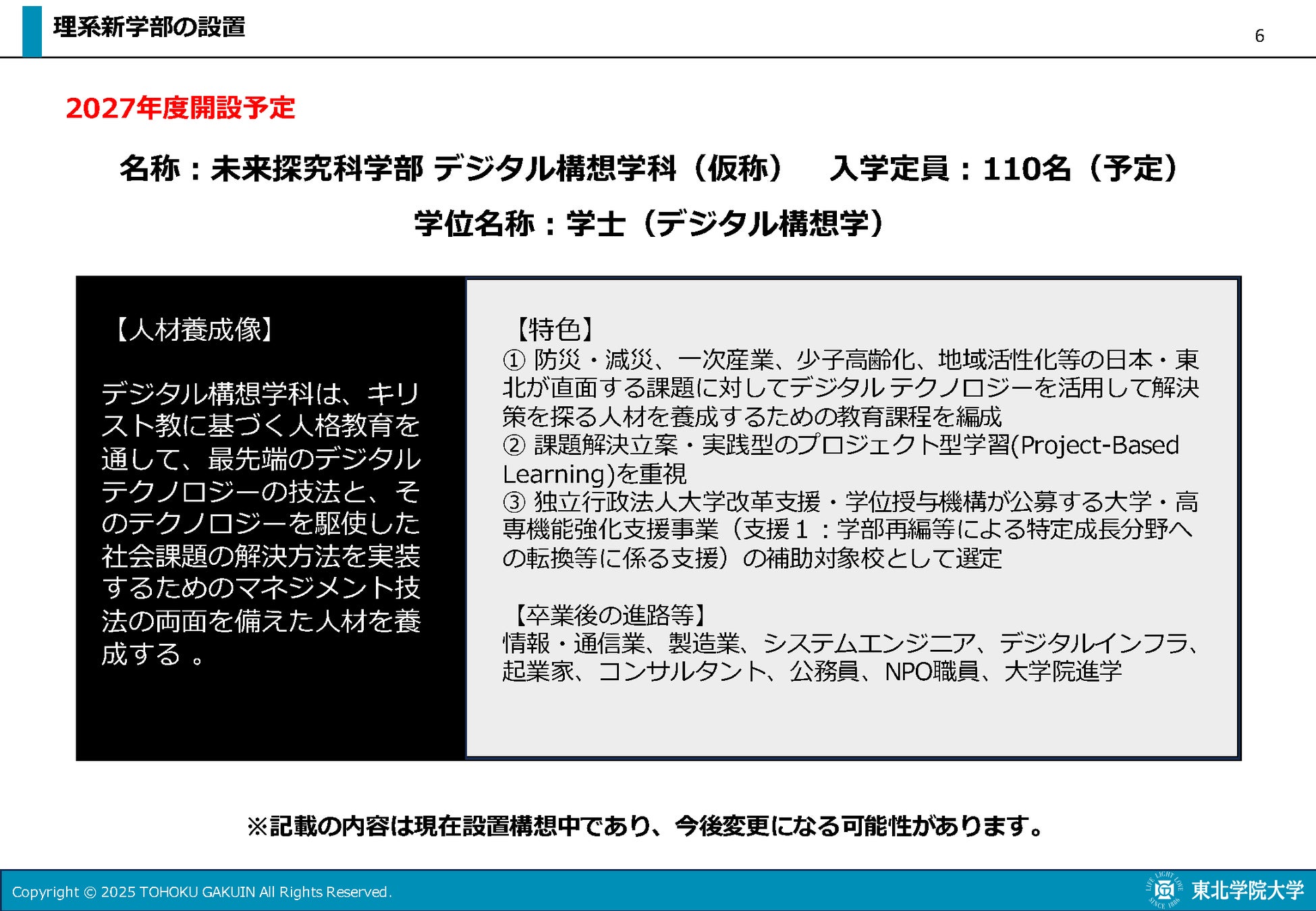 2027年度に設置を予定している「未来探究科学部 デジタル構想学科(仮称)」は理系学部として新設。独立行政法人大学改革支援・学位授与機構が公募する「大学・高専機能強化支援事業(支援1:学部再編等による特定成長分野への転換等に係る支援)」の補助対象校として選定され、デジタルテクノロジーを活用して、防災・減災、一次産業、少子高齢化といった日本および東北が直面している社会課題の解決策を構想する人材の養成を目指し、教育課程を編成する構想である。