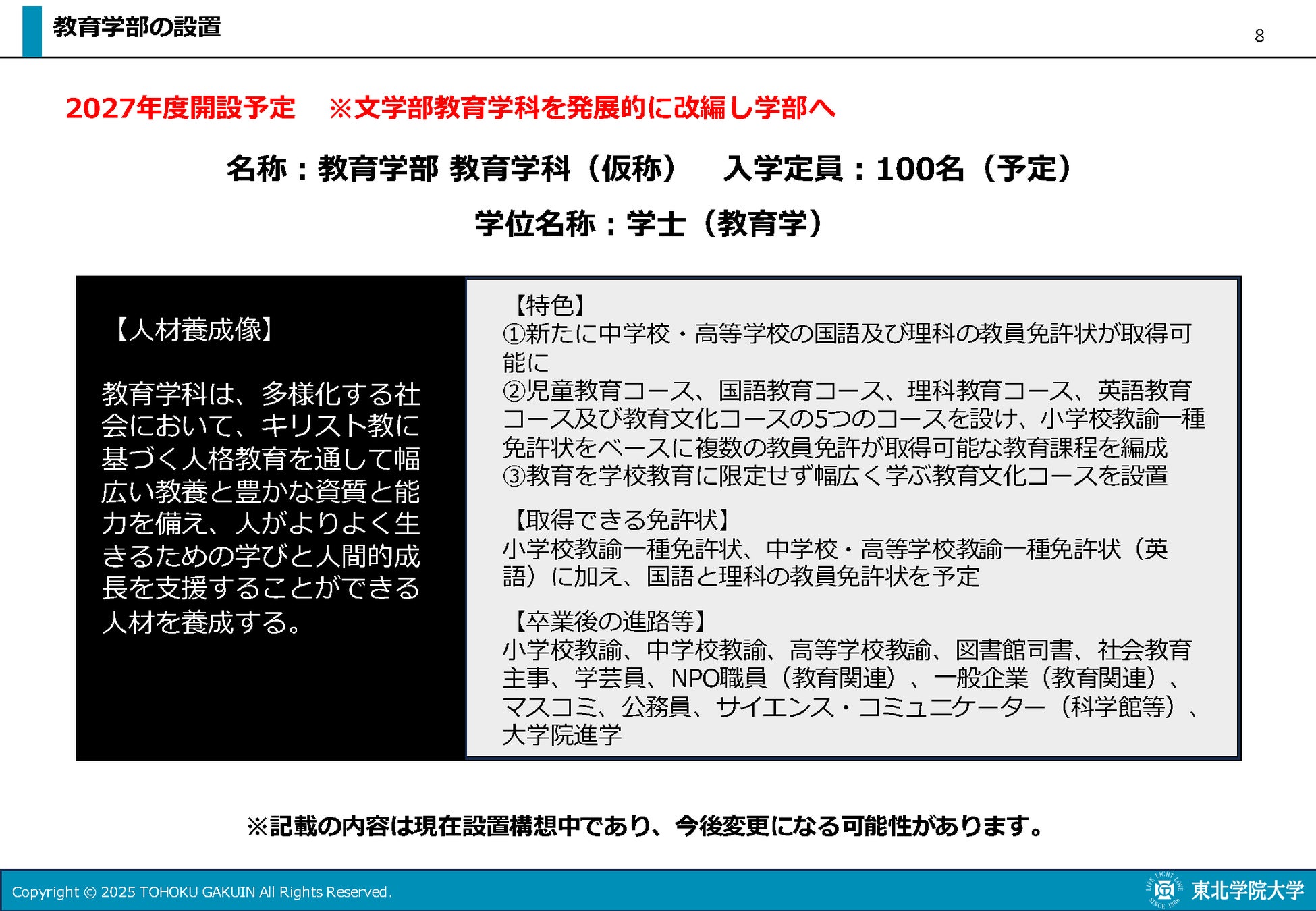 「教育学部 教育学科(仮称)」は既存の「文学部 教育学科」を発展的に改編する。既存学部学科で取得可能な教員免許状は小学校教員および中学校・高等学校の英語教員であったが、改編する学部学科では、中学校・高等学校の国語及び理科の教員免許状も取得可能となる。学校教育を軸とした児童教育コース、国語教育コース、理科教育コース、英語教育コースおよび学校教育に限定せず幅広く学ぶ教育文化コースの5つのコースを設け、小学校教諭一種免許状をベースに複数の教員免許が取得可能な教育課程を編成する構想である。
