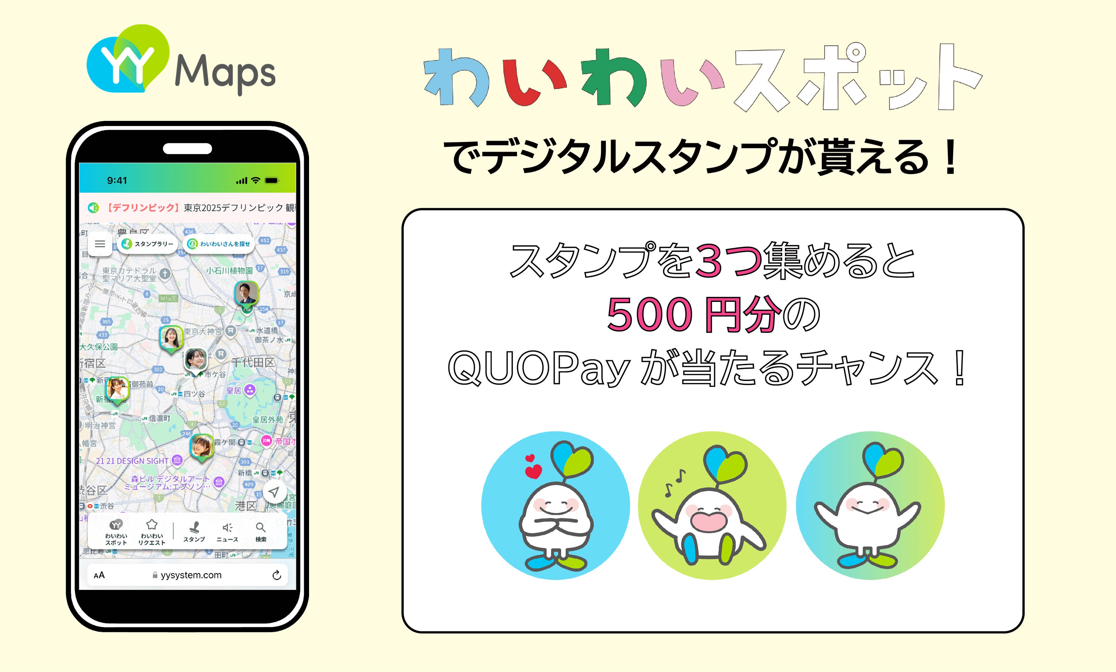 デフリンピック会場など、YYSystemが設置されたスポットを可視化したYYMaps。交通機関、美容院、ホテル、雑貨店、寄席、ドラッグストア、カフェ、サウナ施設など、YYSystemが設置されている場所を探してコミュニケーションをお楽しみいただくことができます。「わいわいスポット」ではデジタルスタンプを貰うことができ、スタンプを3つ集めると500円分のQUO Payが当たるキャンペーンも実施します。
