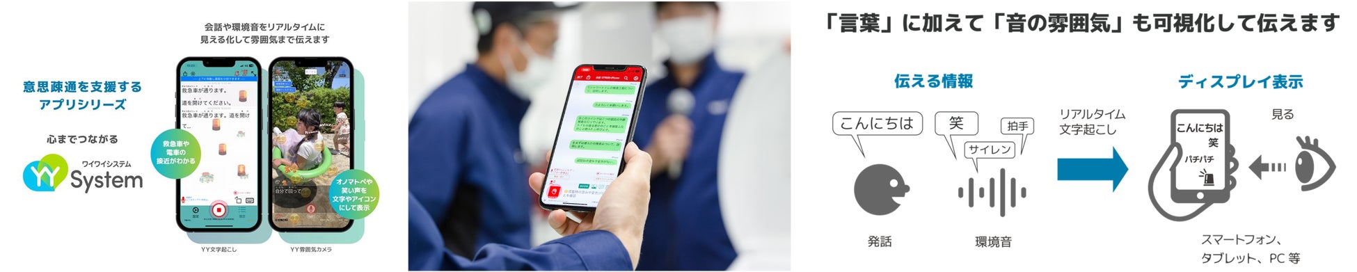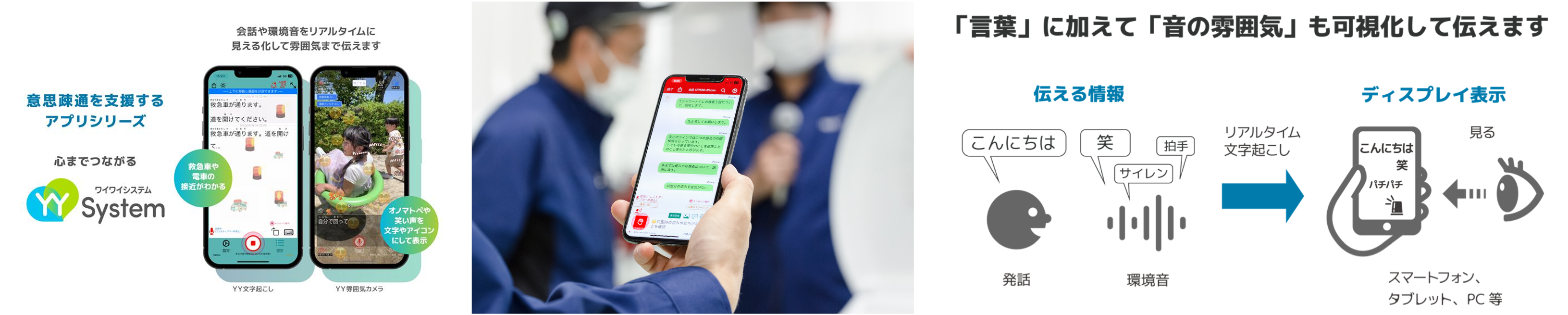 「YYSystem」とは、主に聴覚障がいのある方を対象に、声や音を可視化する独自のアルゴリズムをコアとして「意思疎通支援」を行うアプリケーションシリーズです。「いつでも、どこでも、誰とでも会話ができる」「生活環境音を可視化できる」という特長を活かし、聴覚障がいのある方がコミュニケーションで取り残されない、安心して暮らせる社会を実現します。