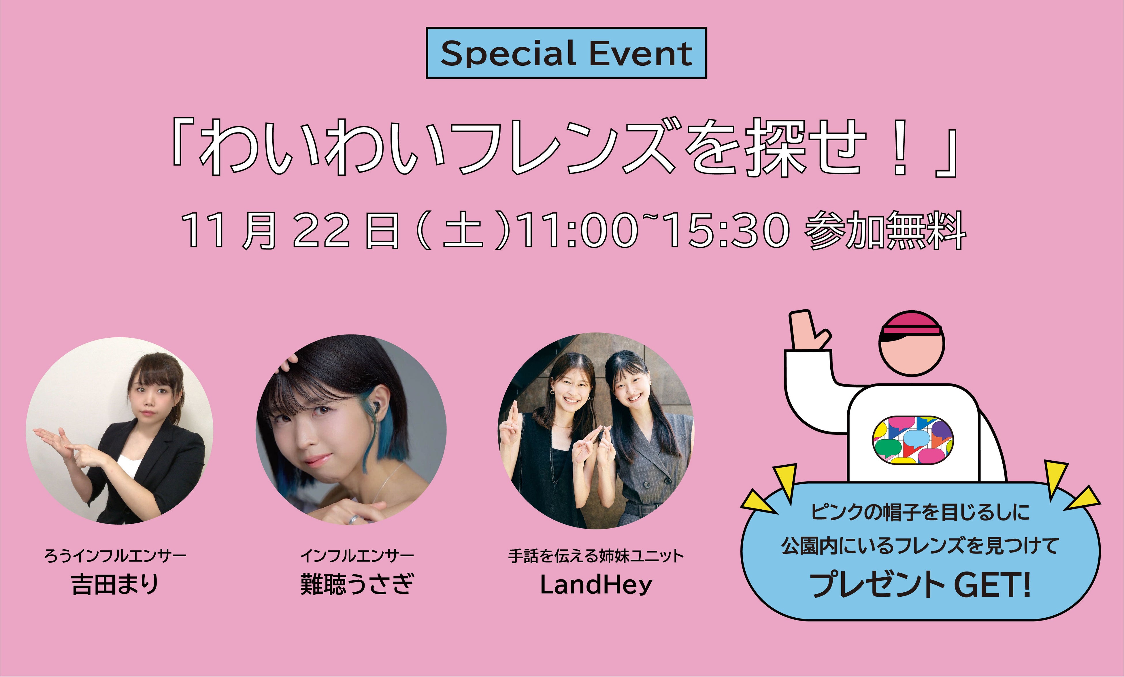 1日限定でYYMaps上の都立明治公園エリア内に「わいわいフレンズ」たちの位置情報が出現します。当日は「わいわいフレンズ」として、ろうインフルエンサーの吉田まりさん、インフルエンサーの難聴うさぎさん、手話を伝える姉妹ユニットのLand Heyさんが参加予定です。フレンズを探して声を掛け、条件をクリアすると限定グッズがもらえるスペシャルイベントにぜひご参加ください。聞こえ方や言語の違う人同士が楽しみながらコミュニケーションできる機会作りにつなげます。