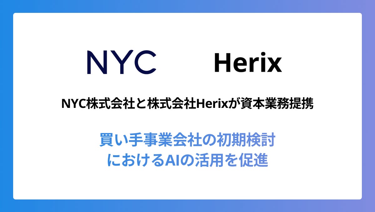 株式会社Herix(本社:東京都中央区、代表取締役社長:中村丞、以下「Herix」)は、NYC株式会社(本社:東京都中央区、代表取締役:中塚庸仁、以下「NYC」)と戦略的資本業務提携を締結し、M&Aやスタートアップ投資を行う事業会社の、初期検討におけるAI活用の促進のために協業を開始したことをお知らせいたします。