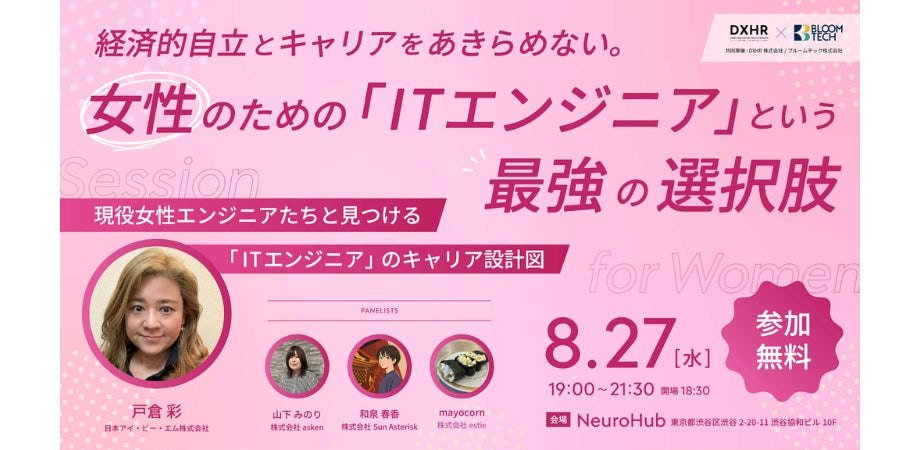 ITエンジニアのキャリア支援を行う株式会社ブルームテック(本社:東京都渋谷区、代表取締役:小山 竜男)は、DXHR株式会社と共催で女性ITエンジニア向けキャリア戦略イベントを開催いたします。