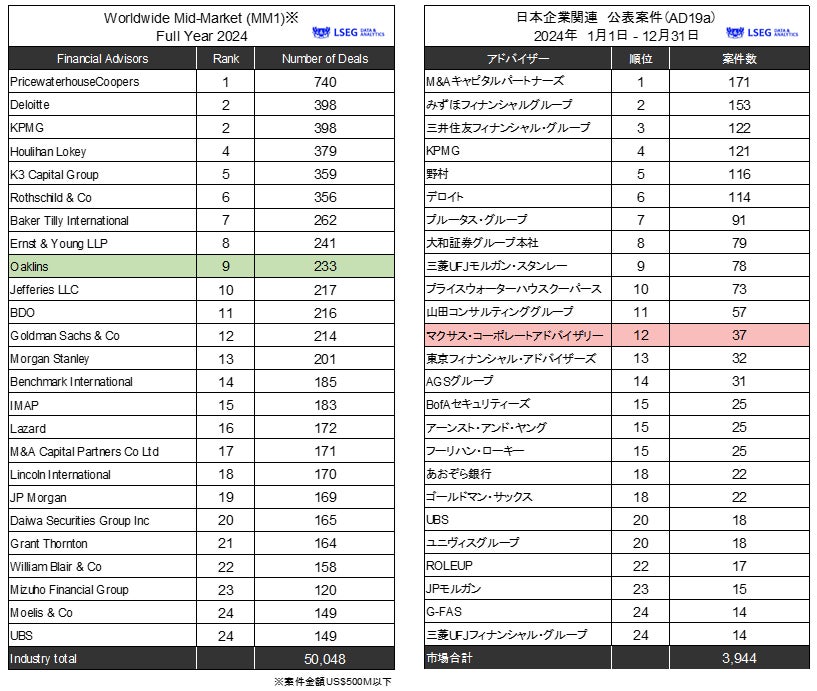Oaklinsは、世界40ヵ国以上・60拠点を構える独立系M&Aファームのネットワークであり、800名を超えるプロフェッショナルが在籍しています。これまでに累計5,000件以上のM&A案件を手掛け、うち30%以上がクロスボーダー取引です。主に500万~1億米ドル規模の中堅企業向けM&Aを中心に、15の業界専門チームによる深い業界知見とグローバルネットワークを活かして、売却・買収・資金調達など多様なニーズに対応しており、LSEG発表の「Global M&A Mid-Market Advisory Full Year 2024」において、9位にランキングされております。