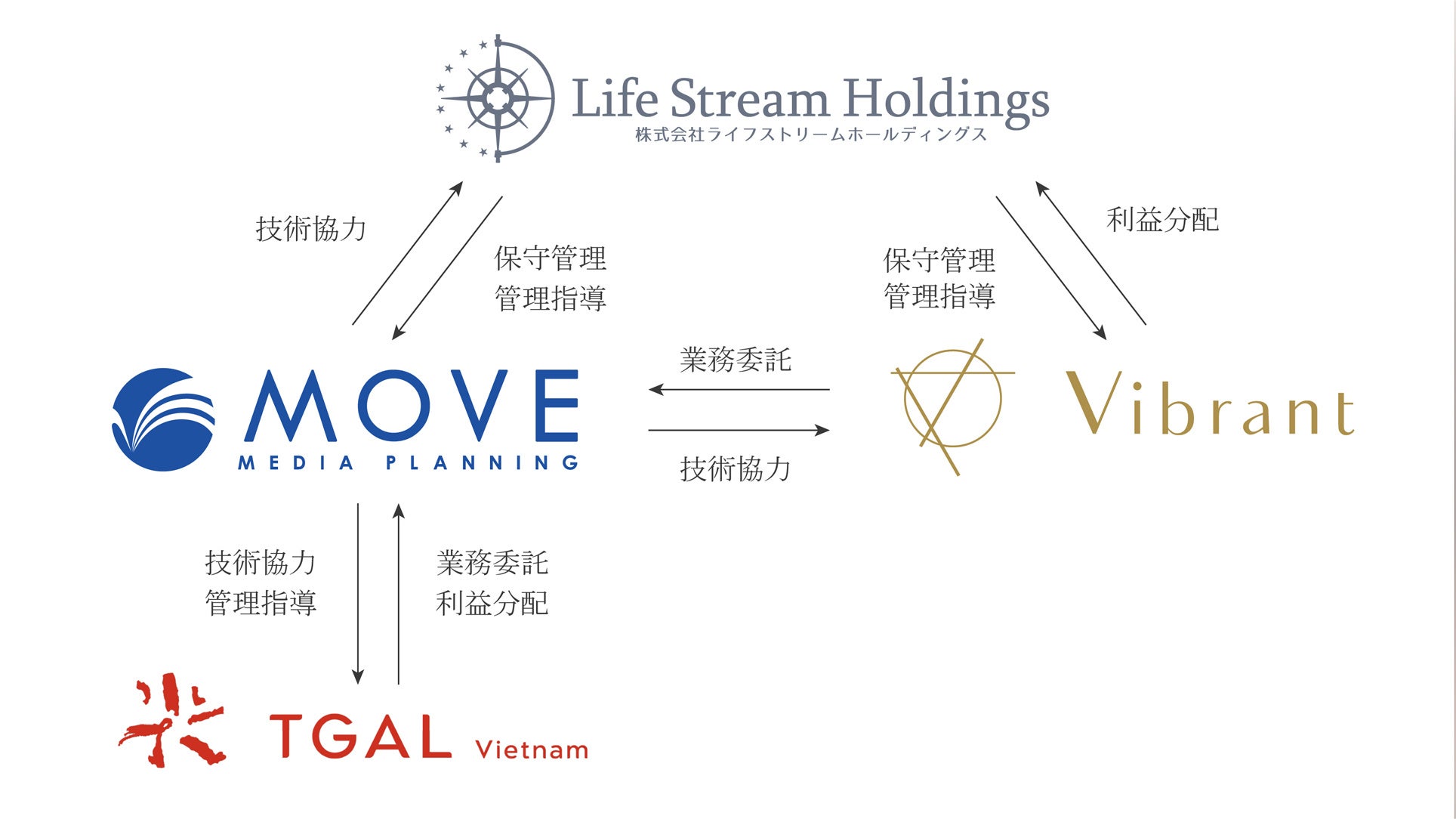 『人が輝き幸せになることの気付きを届け 人と社会を元気にする』を理念のもと、株式会社ムーブと株式会社ヴィブラント、そして今回ムーブの子会社となったTGAL Vietnam の計3社のホールディングス経営を行っています。