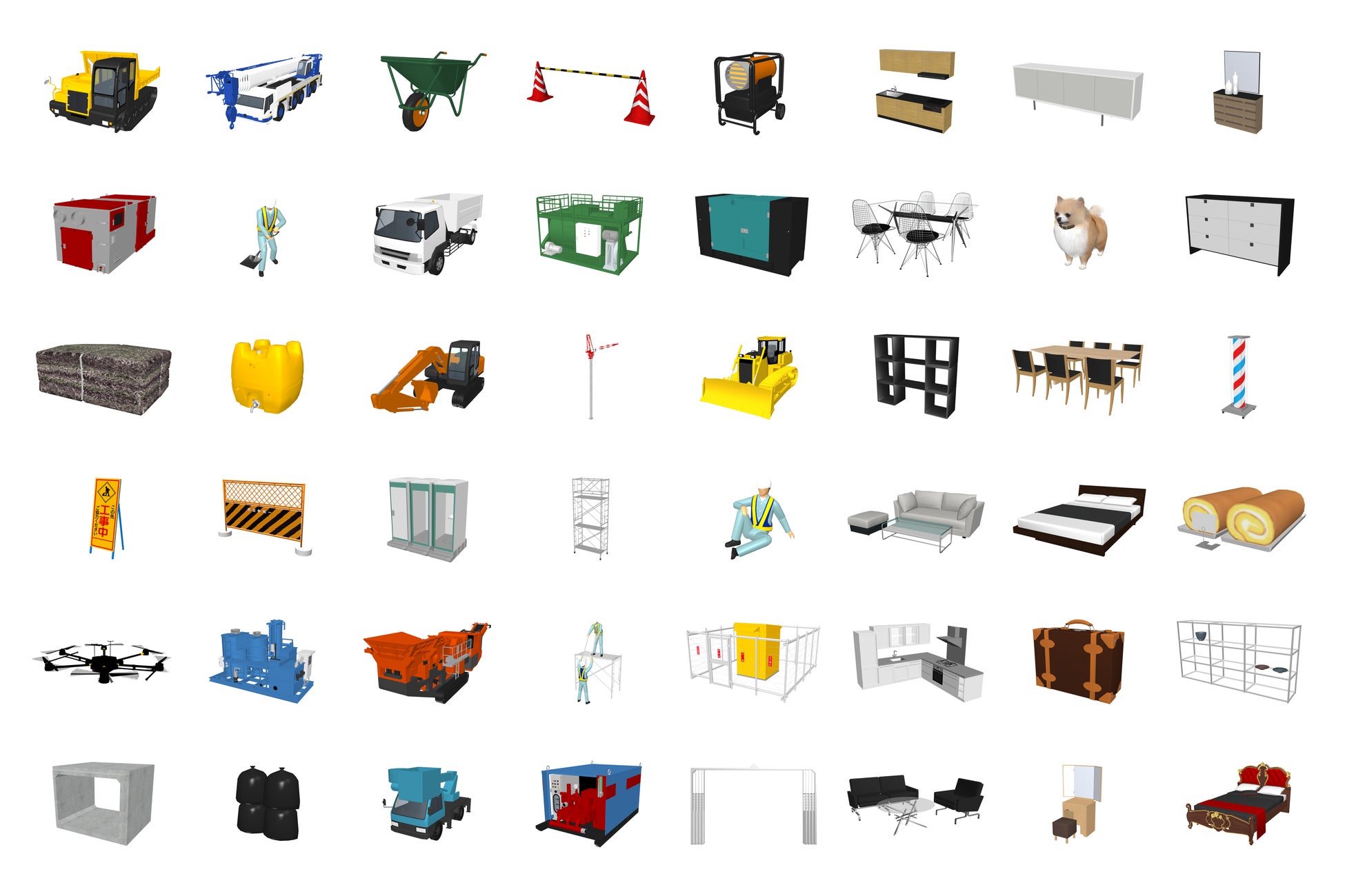 素材はFBX、3DS、OBJ、DXF(3D)、DWG(3D)、M3D形式で、建設・建築業務に適した軽量な低ポリゴンデータを採用し、CG制作やシミュレーション、プレゼンテーション資料作成など幅広い用途に利用可能です。