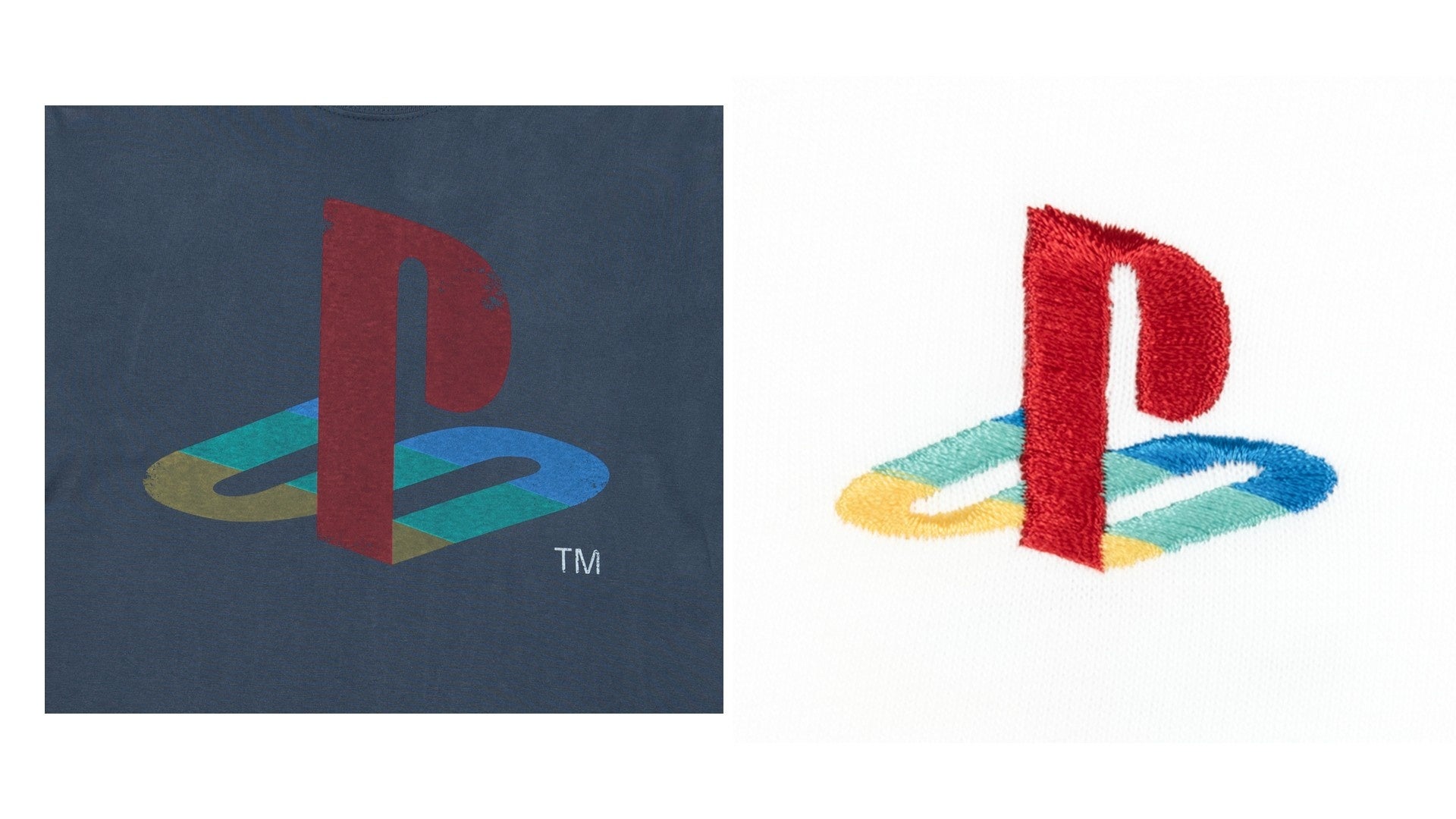 『ASOBI GRAPHT』のTシャツコレクションでは、初代PlayStation®でおなじみの4色カラーの「PlayStationファミリーマーク」やロゴを、手捺染(てなっせん)や刺繍といった職人の仕事によって表現しています。ヴィンテージのような風合いを持つプリントは、職人が一枚一枚手作業で染料を刷り込む伝統的な技法、手捺染によるものです。刺繍もまた、絵を図案へと的確に落とし込み、糸を重ねることや糸目(縫い目)を工夫することで微細な陰影や立体感まで緻密に表現しています。