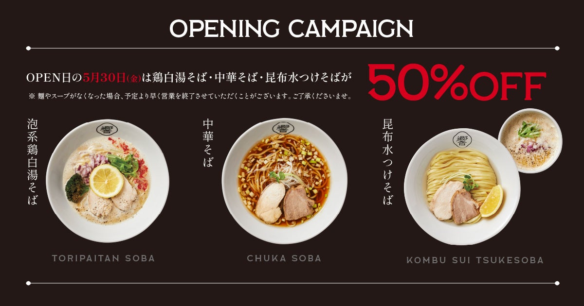 オープニングキャンペーンとしてOPEN日の5/30(金)は鶏白湯そば、中華そば、つけそばを半額でご提供します。