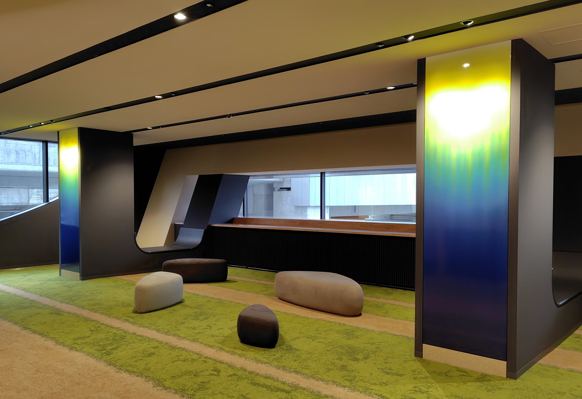 徳田八十吉の代表作「瑞穂」(みずほ)「猩々」(しょうじょう)のデザインを活かした大型の陶板柱