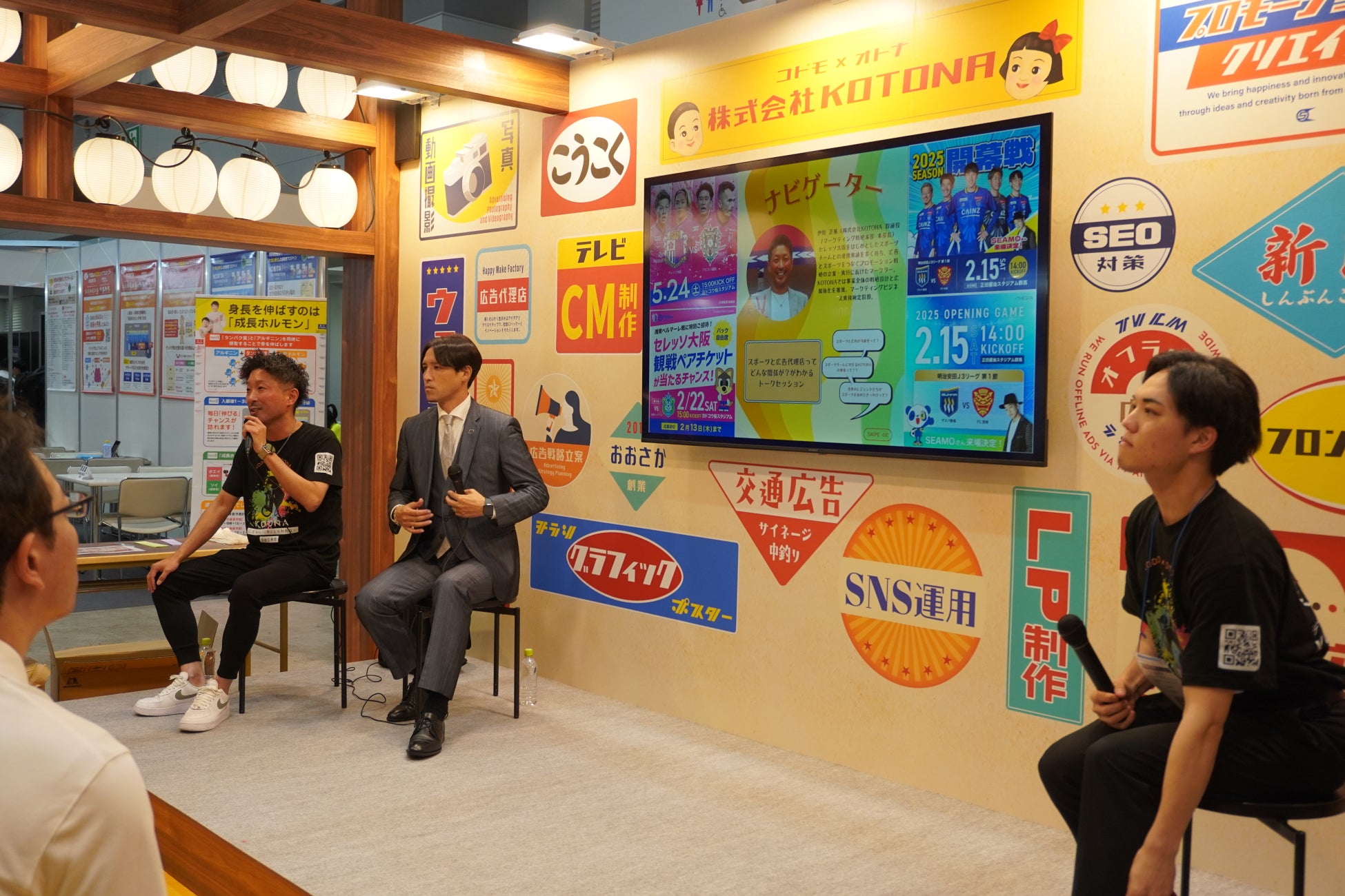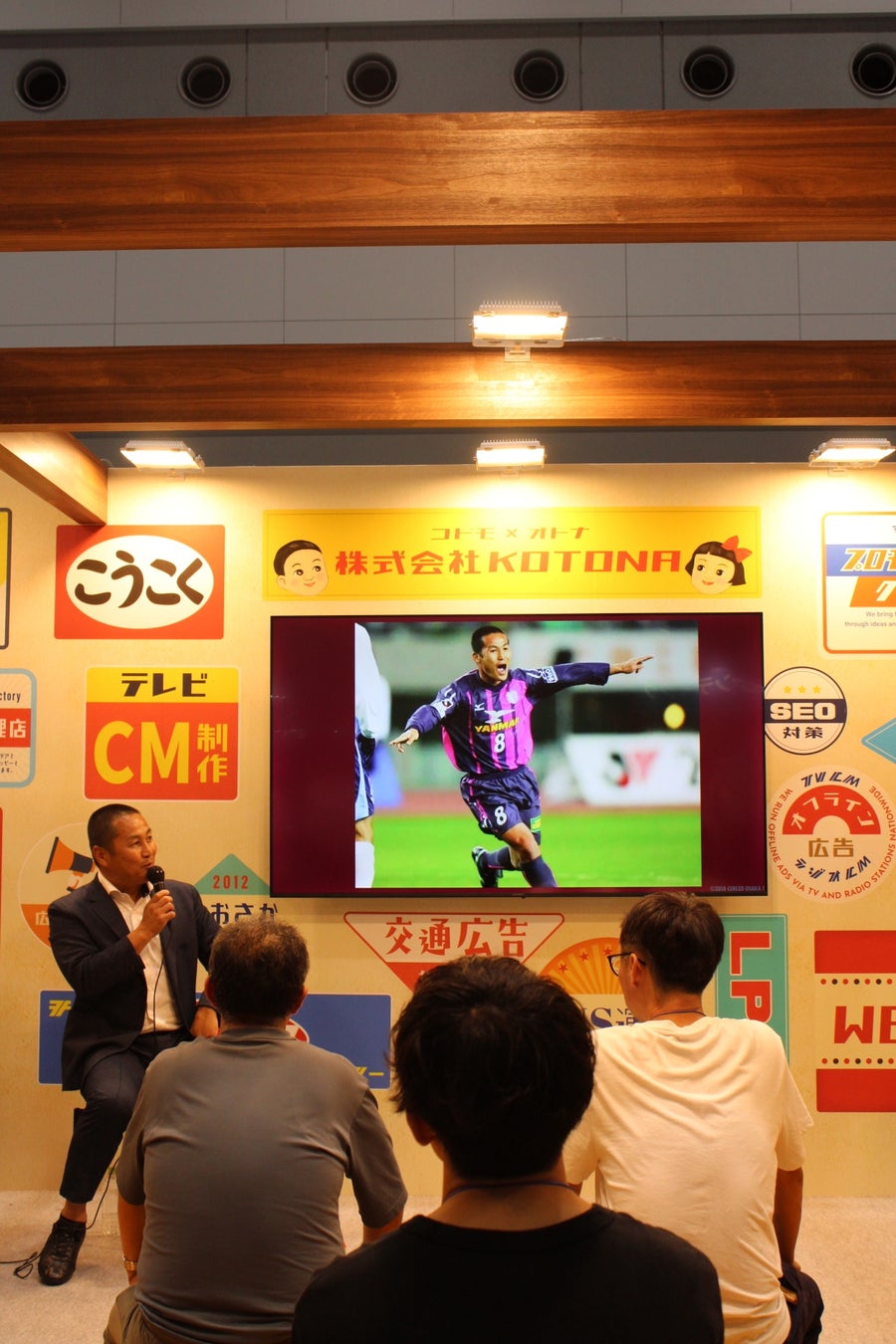 最終日に登壇したのは元サッカー日本代表で現在はセレッソ大阪会長の森島寛晃氏。トークセッションが始まる前からブースの前には森島氏が登壇することをチラシで知った来場者の方が多く立ち止まり盛り上がっていました。サッカーを始めたきっかけや2002年の日韓ワールドカップ、長居スタジアムで行われたチュニジア戦での得点についてお話していただきました。当時の得点を決めたシーンがモニターで映像に流れると客席や立ち見で見ていた人たちからも大きな拍手が沸き起こり当時の盛り上がりを再確認。また、KOTONAがセレッソ大阪に行っているPR施策についてKOTONA取締役の伊勢正基氏が語りました。