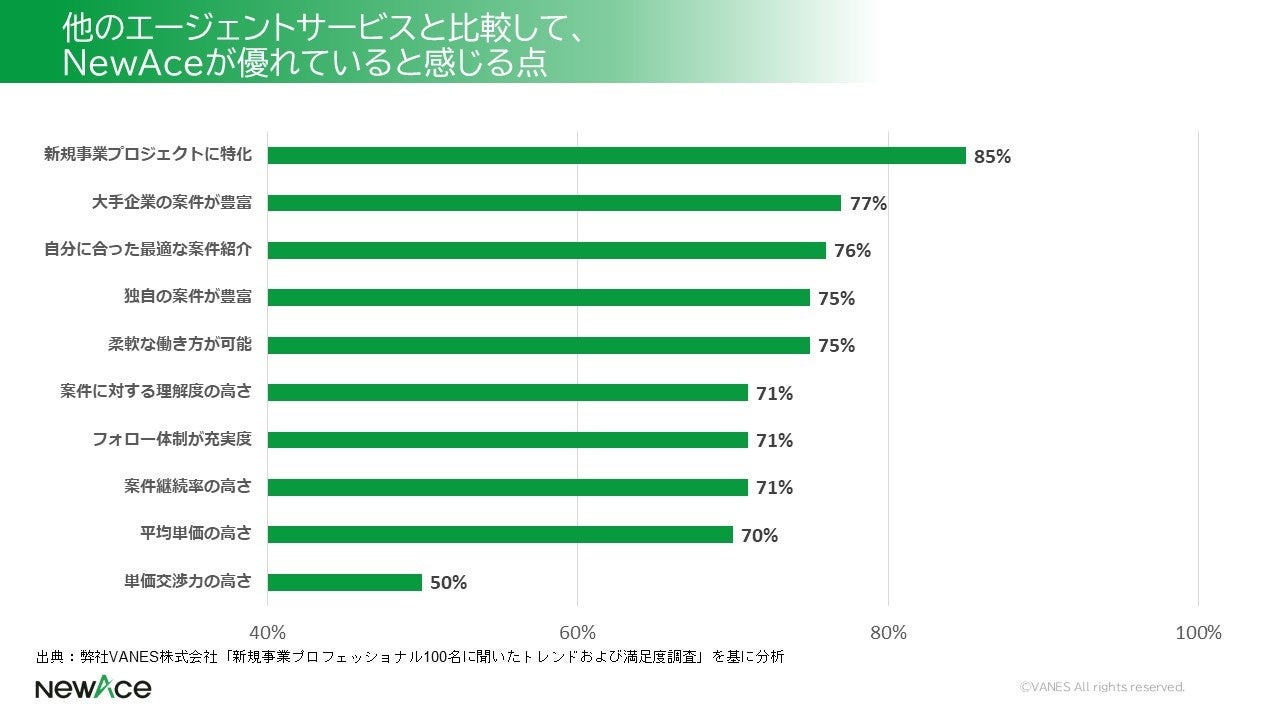 プロがNewAceを強く推奨する最大の理由は、「新規事業プロジェクトに特化(85%)」している点です。