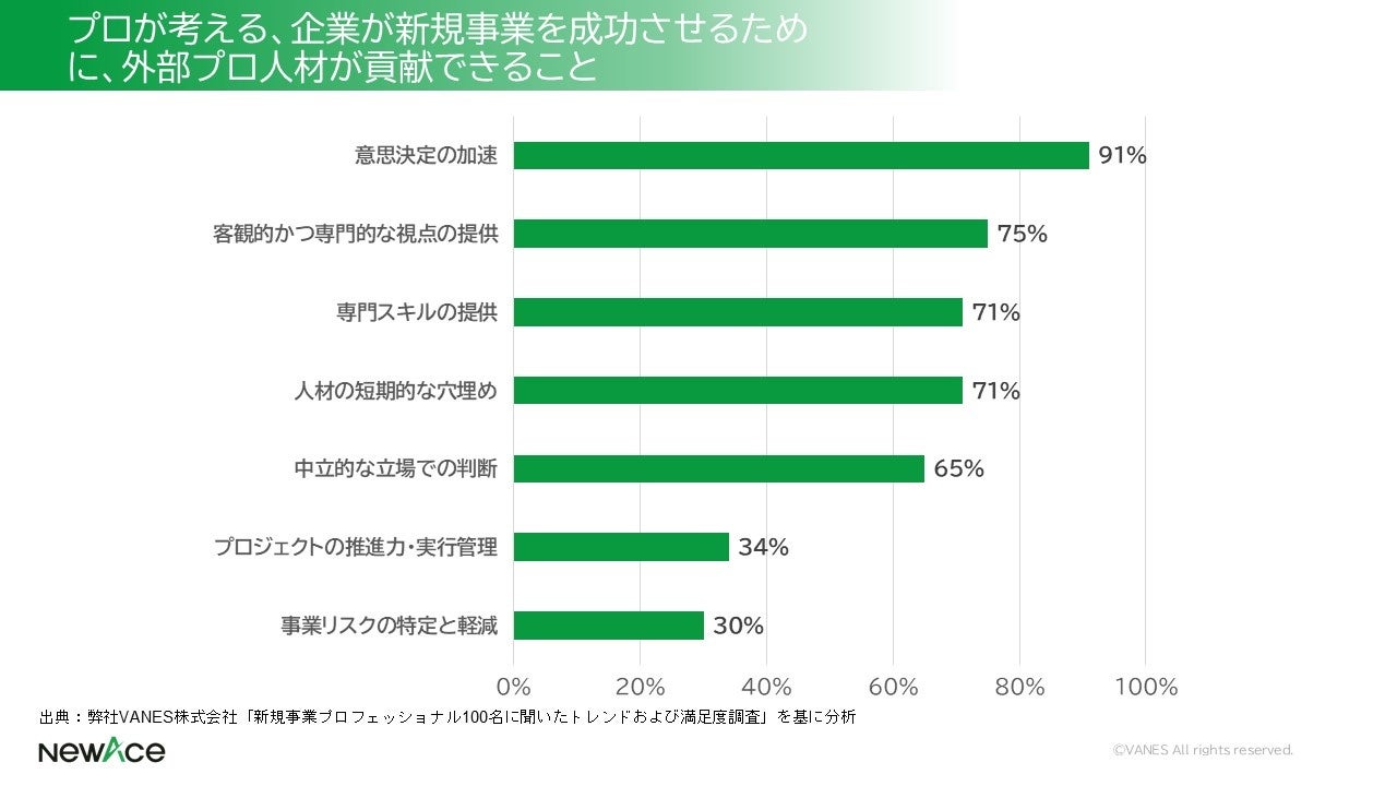 調査の結果、プロの91%が「意思決定の加速」を最大の貢献価値と認識していることが判明。新規事業を進める企業において、意思決定の遅れを解消することが、外部プロ活用における最大のニーズであり、その停滞打破こそが成功の鍵であることが示唆されました。