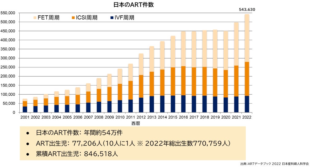 2024年の出生数は68万6061人と過去最低を更新し、少子化の進行が深刻さを増しています。2022年にはARTによって7万7206人が生を受け、これは同年の総出生数の約10%に相当します。 現在10人に1人の子どもがARTによって生まれている計算となり、生殖医療の重要性は一層高まっています。