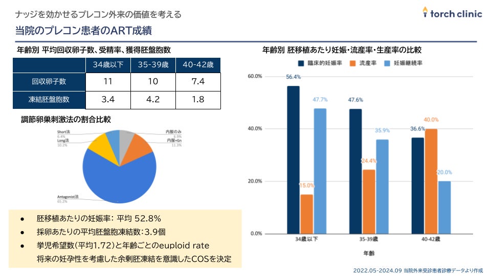 また、プレコンセプションケア外来を経て不妊治療へ移行した女性は全体の3割を超え、ARTに進んだケースにおける平均妊娠率は52.8%を記録しています。1回の採卵あたりの胚盤胞凍結数も平均3.9個と高く、将来の第2子・第3子を見据えた余剰胚獲得(家族計画の実現)にも寄与しています。
