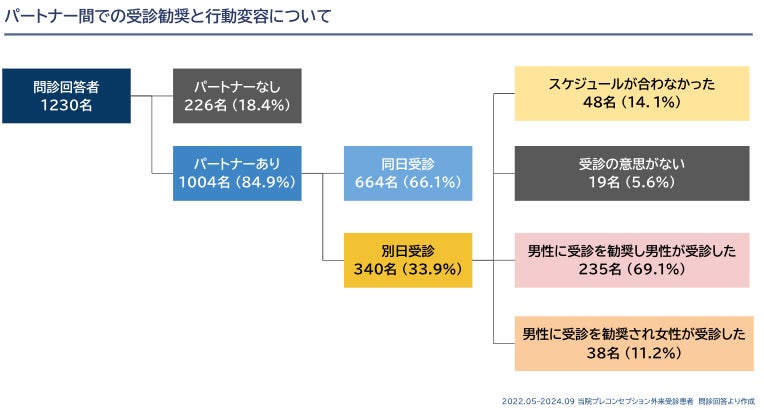 以下はプレコンセプションケア外来を受診した女性1,230名の分析結果です。興味深いのは、女性単独で受診したケースのうち約7割が、後日パートナーを同伴して再受診していた点です。これは、適切な情報提供とカウンセリングが行動変容を促している可能性を示唆しています。