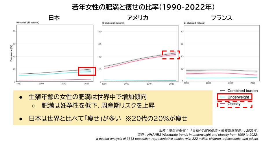日本は若年女性の約20%がBMI18.5未満の「やせ体型」に該当し、これは米国(約5%)、フランス(約8%)と比較しても際立って高い水準です。SNSやファッション業界による痩身志向に加え、栄養教育の不足が深刻な背景要因となっています。