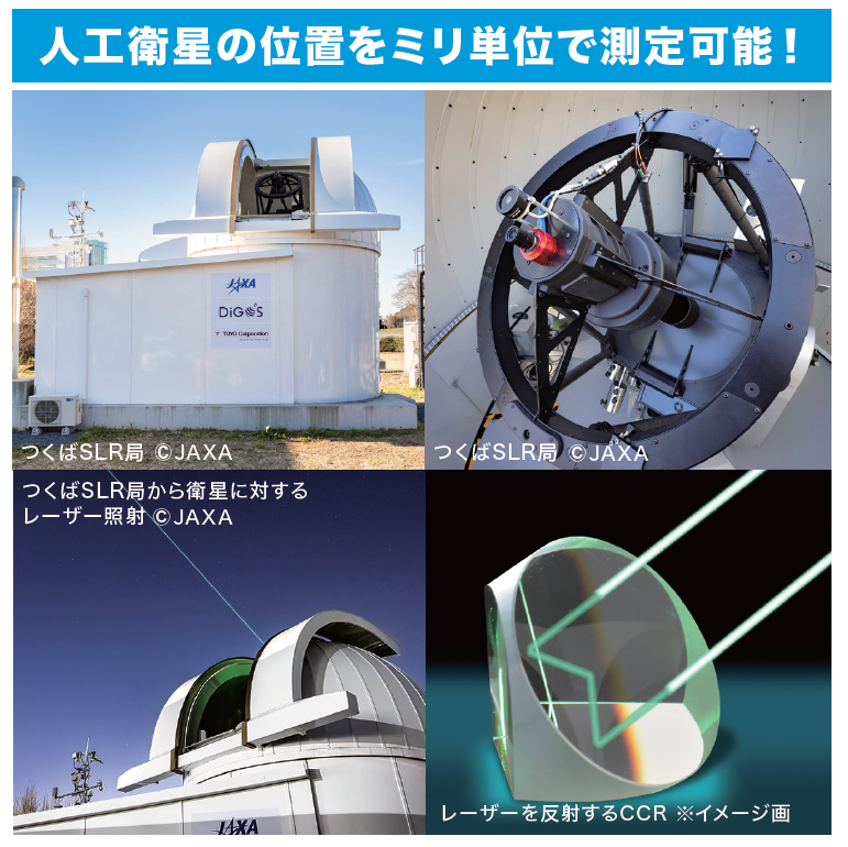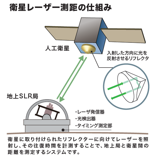 SLR(Satellite Laser Ranging:衛星レーザー測距)は、地上局から人工衛星にレーザー光を照射し、その往復時間から距離を高精度に計測する技術です。この測距データは人工衛星の軌道決定や管理に不可欠であり、近年深刻化する宇宙ゴミ(スペースデブリ)との衝突回避にも活用されています。人工衛星の運用が終了し宇宙ゴミとなった場合でも軌道把握が可能となることから、宇宙ゴミ問題の解決手段の一つとして期待されています。