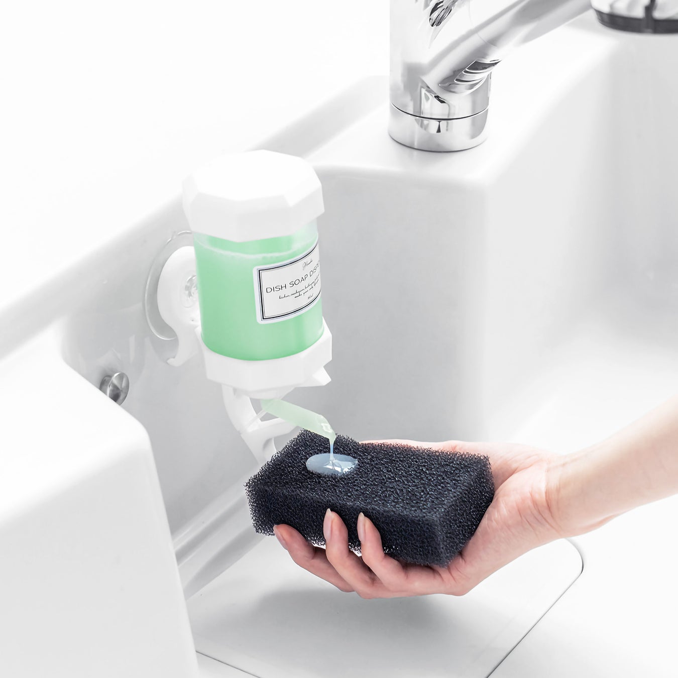 レバーをPUSHするだけ、片手で好きな量の洗剤を出せるディスペンサー。残さず使い切れる下から出る設計。電池不要、丸洗いOK。