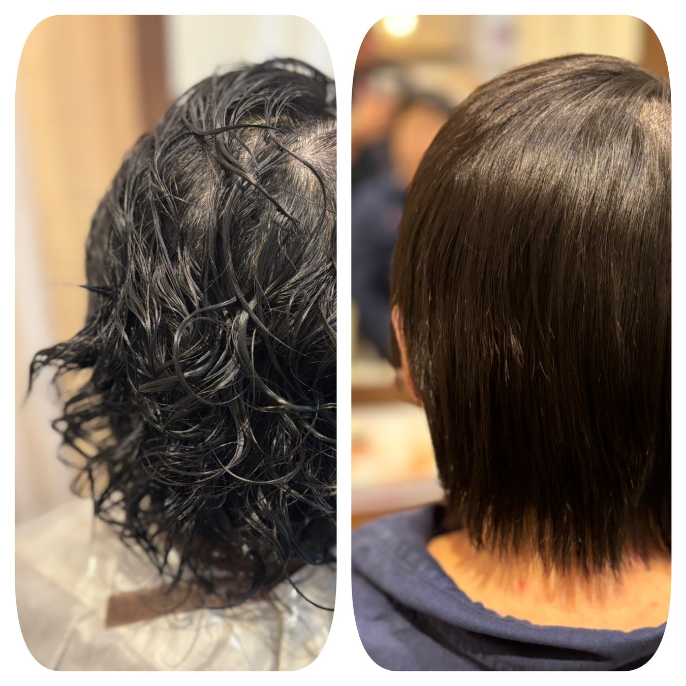 抗がん剤治療後の強いくせ毛、 更年期による特有の細かいくせ毛に悩んでいる人、 髪へのダメージを最小限に抑えたい人、パーマやカラーを繰り返したダメージ毛 、ブリーチ毛(要相談)、 自然なストレートヘアにしたい人などなど・・・