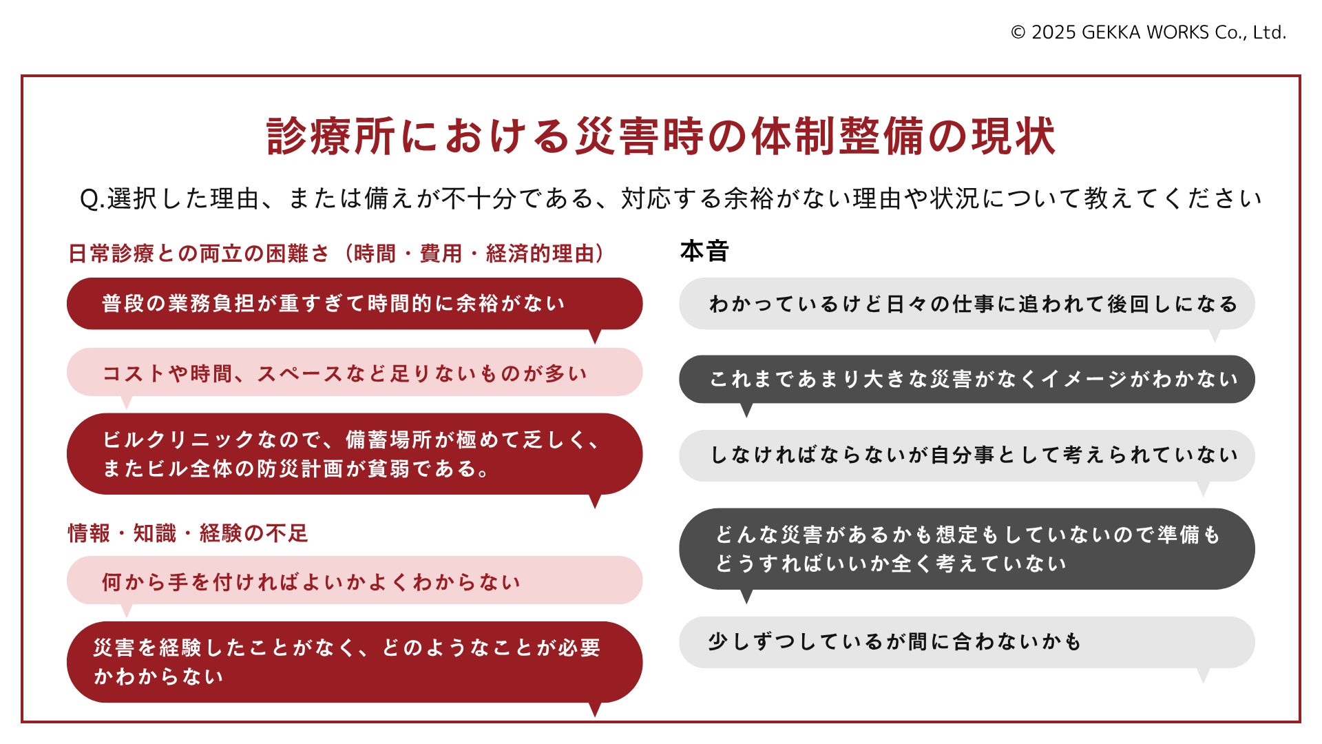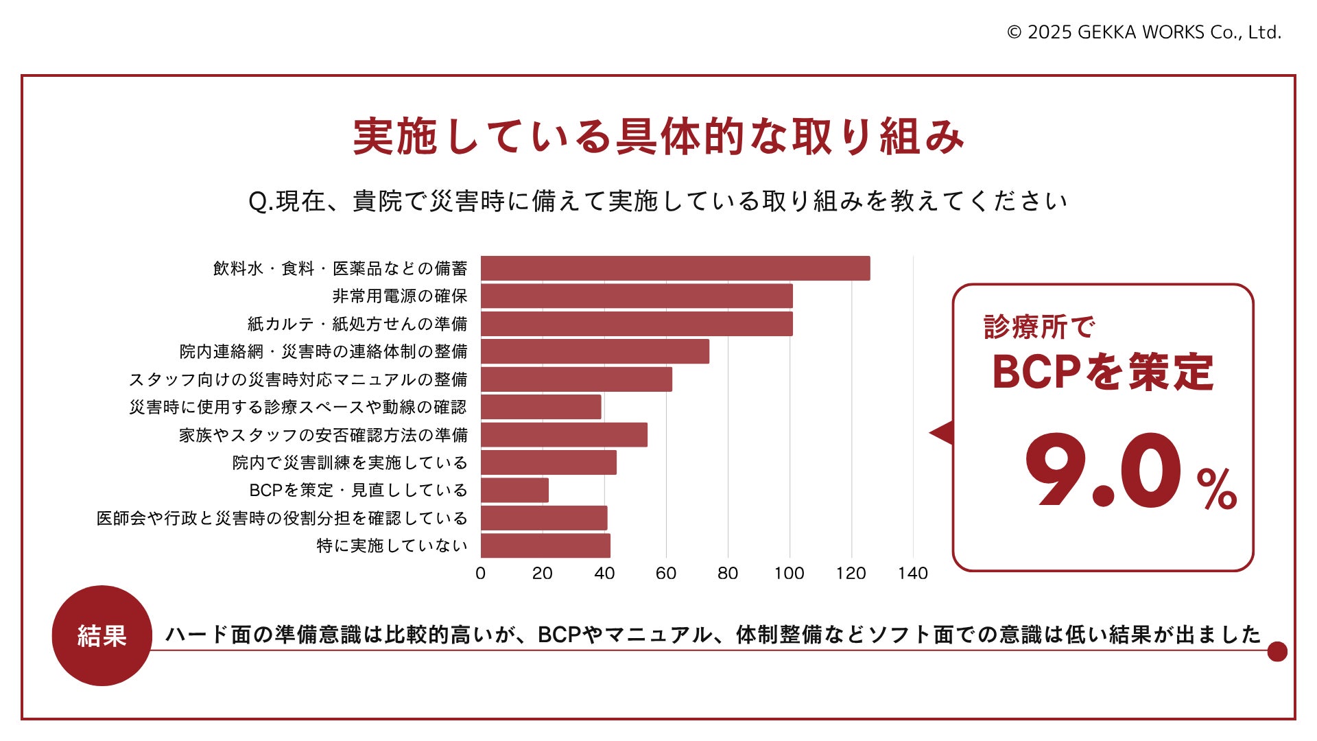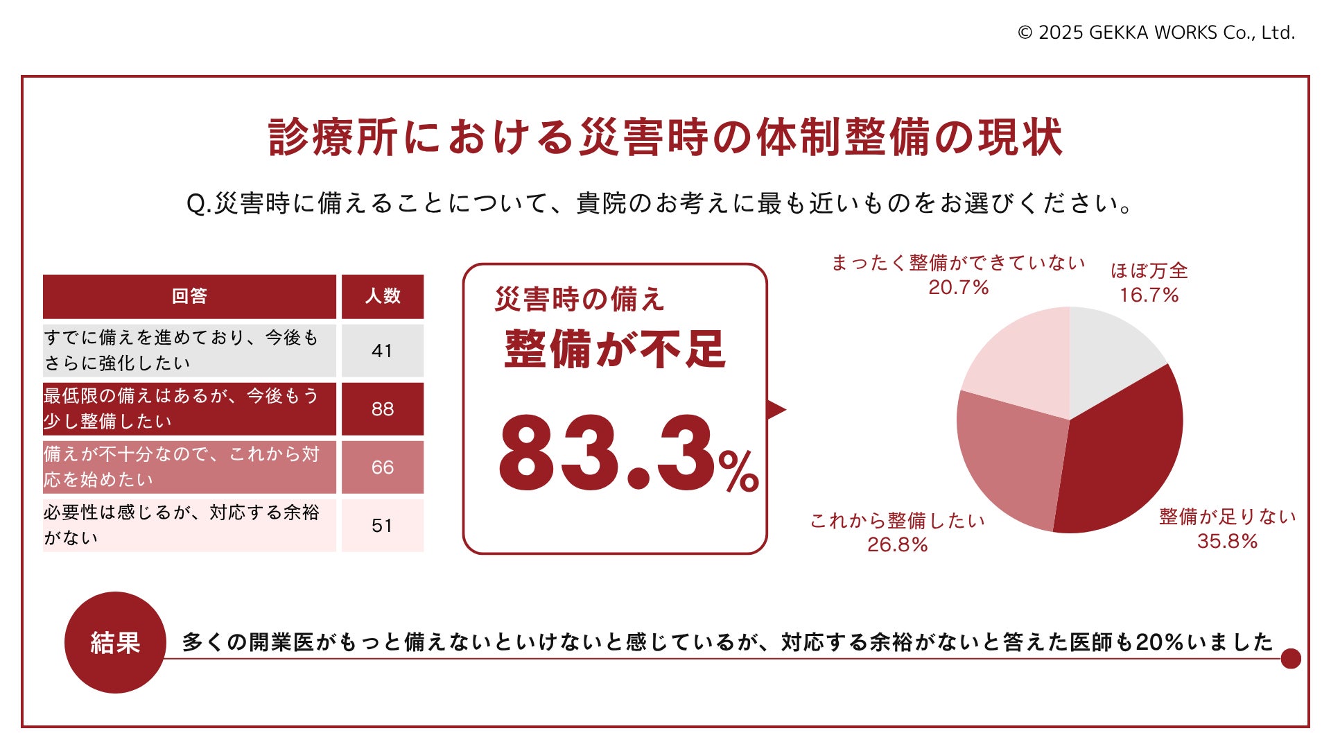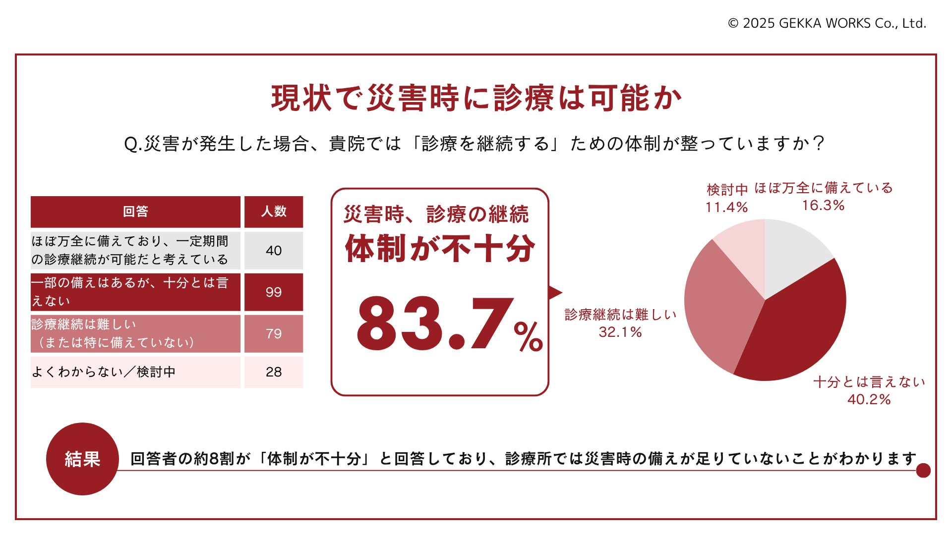 医師専用コミュニケーションサービス『ドクシル』を運営する株式会社ゲッカワークス(本社:東京都千代田区、代表取締役:大橋茂樹)は2025年6月9日、開業している医師246名を対象に実施した「災害時における診療体制について」の結果を発表しました。調査では、83.7%が「災害時、診療を継続するための体制が不十分」と回答し、BCP(事業継続計画)を策定している診療所は1割にも満たないことが明らかになりました。