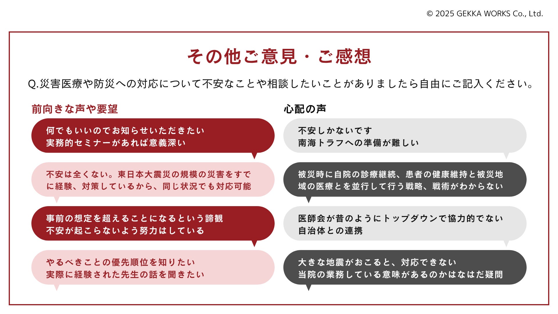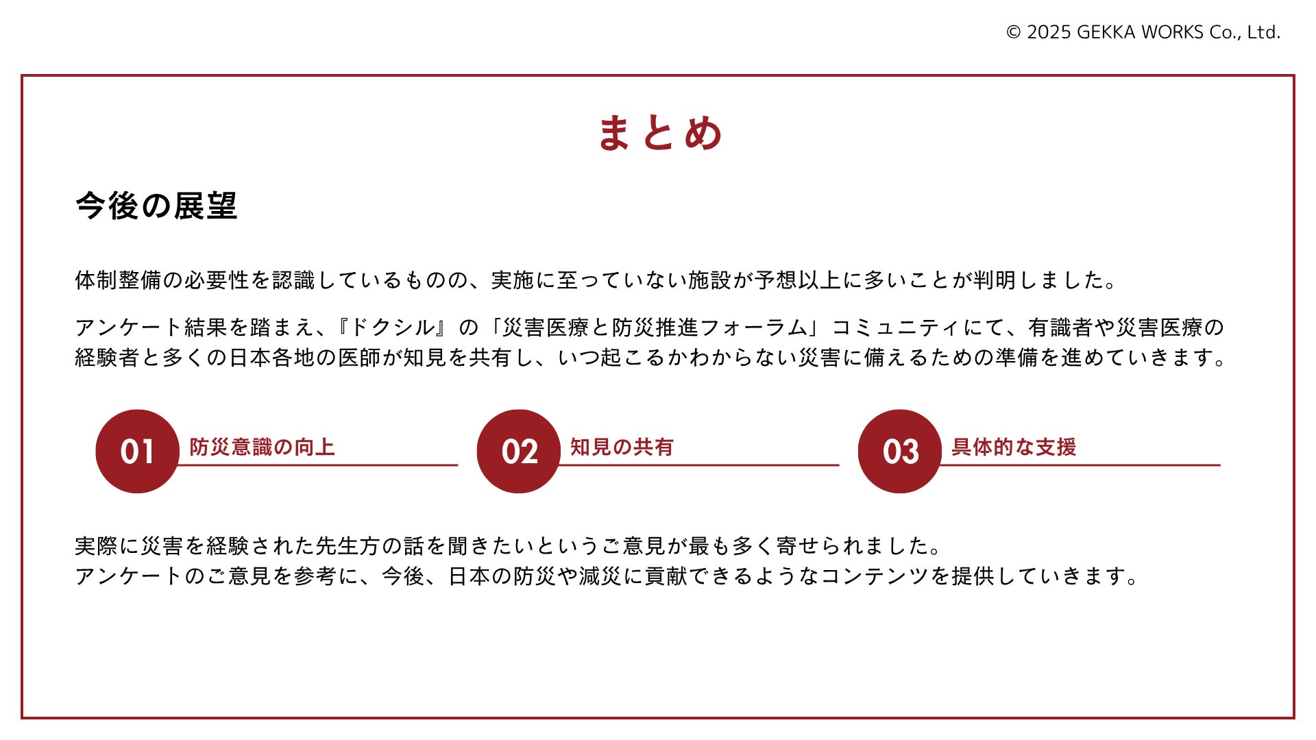 弊社が運営する『ドクシル』では「災害医療と防災推進フォーラム」コミュニティにてアンケートで回答いただいたような不安と危機感を感じつつも何から始めたらよいか迷っている医師と災害医療の専門家、災害を経験し乗り越えた医師をつなぎ、防災・減災に資するコンテンツや情報の提供や議論を行なってまいります。『ドクシル』は医師専用サービスであるため、常に医師会員を募っています。