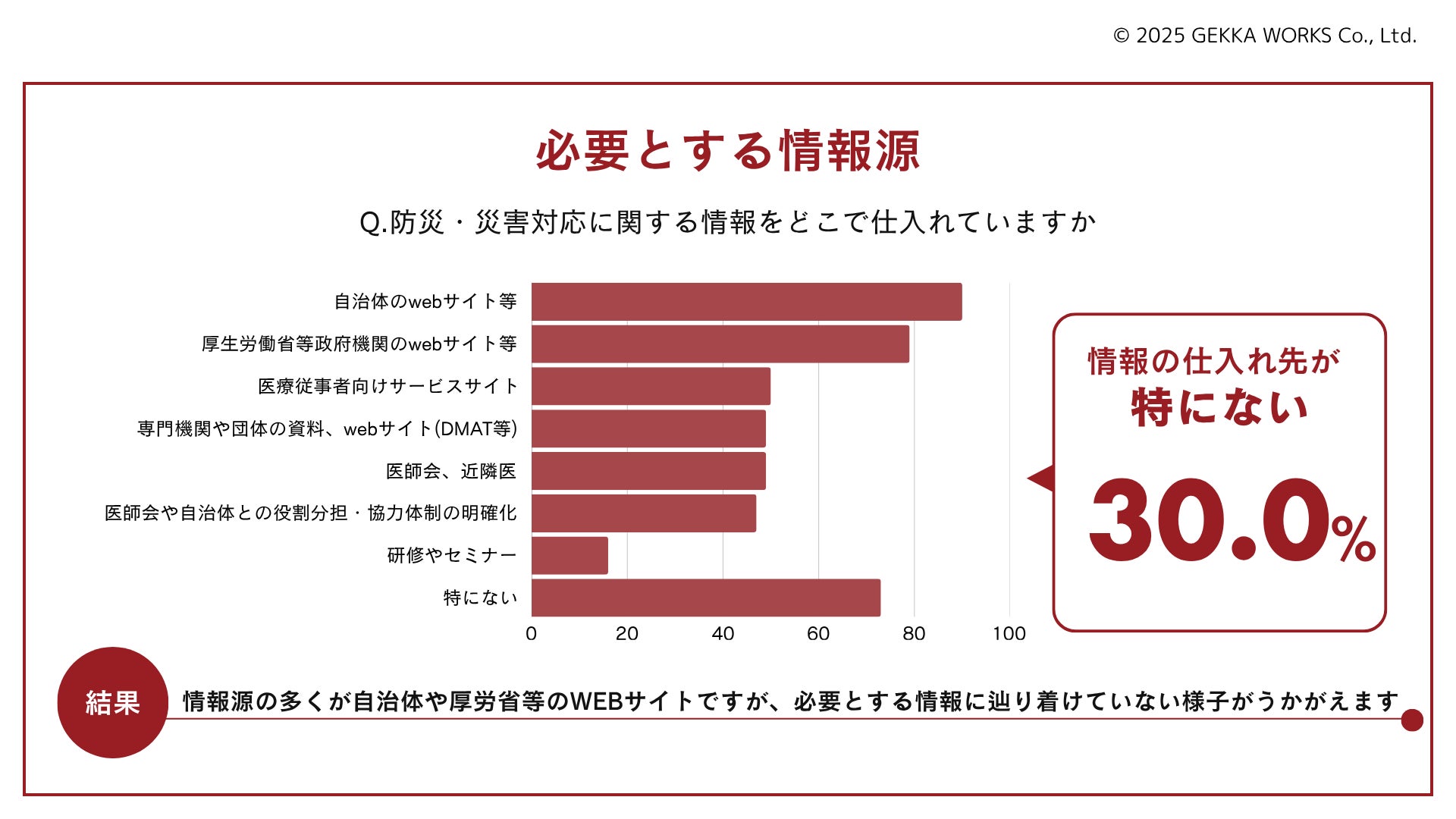 防災・災害対応に関する情報源は30%の医師が「特になし」と回答