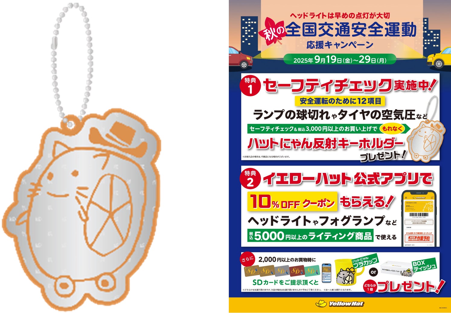 また、イエローハット全店舗において、税込3,000円以上のお買物の上、無料点検を受けていただいた方に「ハットにゃん 反射キーホルダー」をプレゼントする店舗キャンペーンを実施いたします。