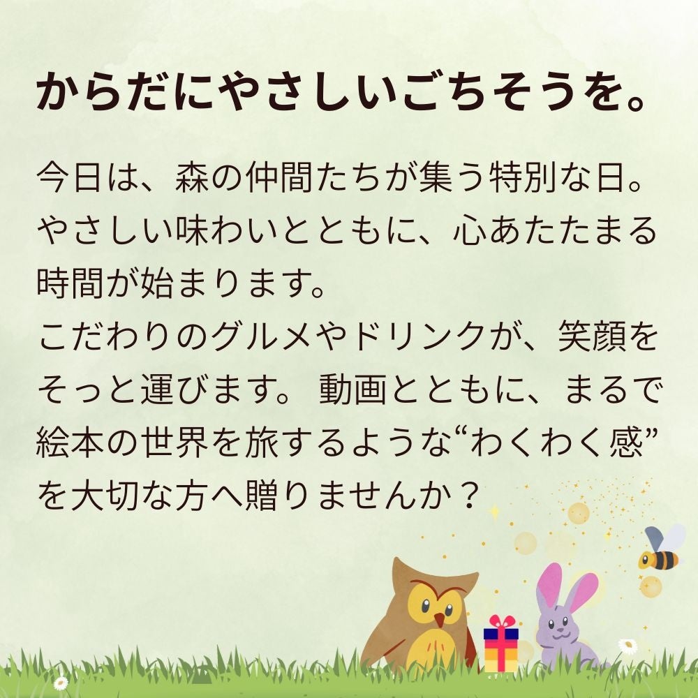 「グルメセレクション」は、絵本から飛び出したような可愛い森の仲間たちの物語とともに、お好きな“プチ贅沢グルメ”を楽しく選べるeギフトカタログです。