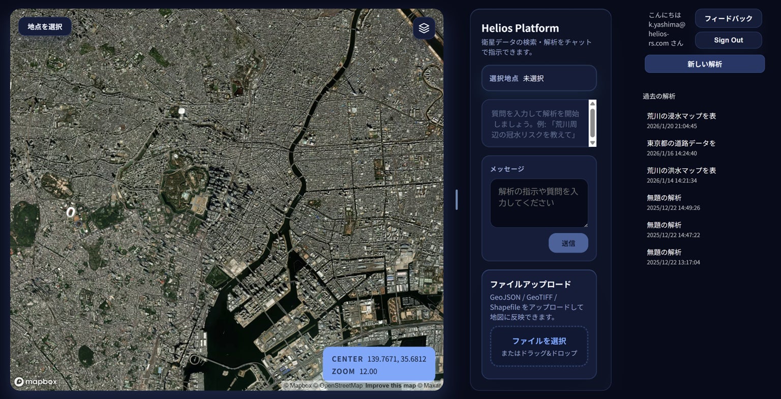 リモートセンシングデータ解析および「地球知能インフラ」の構築を行う株式会社Helios(本社:東京都墨田区、代表取締役:八島京平 / 佐々木謙一、以下Helios)は、自然言語による対話型インターフェースを備えた地理空間解析プラットフォーム「Helios Platform(ヘリオス・プラットフォーム)」のβ版を、2026年2月2日(月)より提供開始いたします。本プラットフォームは、大規模言語モデル(LLM)と当社独自の大規模地球モデル(LEM)構想を組み合わせることで、従来は高度な専門知識を要した衛星データやGIS(地理情報システム)データの解析を、チャット形式の直感的な操作で可能にします。