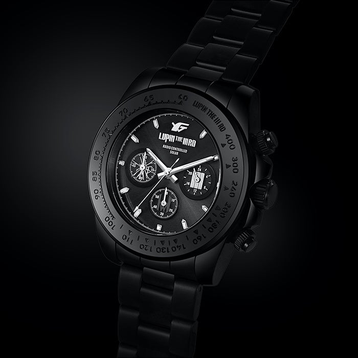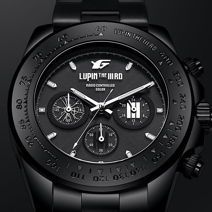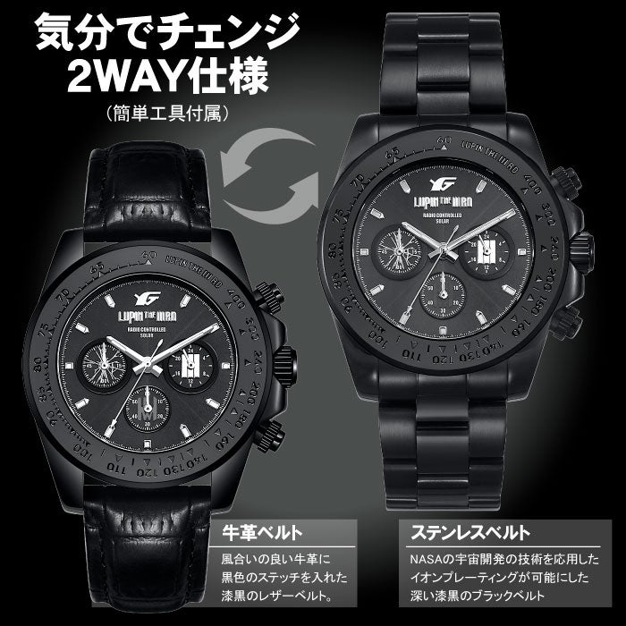 腕時計はルパン三世にとって度々登場する非常に重要なアイコン。①10万年に1秒の誤差と言われる電波式、②電池不要のソーラー充電、③時間を正確に測るストップウォッチ付きのクロノグラフ機構、この『Ⅲ』の機構が組み合わさったまさにルパンにふさわしくルパンも喉から手が出るほど欲しい腕時計。更にステンレス製ベルトに加え、漆黒の革製チェンジベルトが付属してどんなミッションの時でも自然にこなせる仕様。