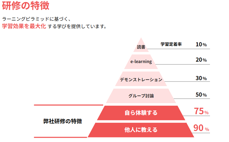 私たちは「ラーニングピラミッド(学習定着率)」に基づき、座学だけでなく「実際に自社の業務課題を見つけ、自分たちの手でシステム(ツール)を作り上げる」という実践型のアプローチにこだわっています。 技術力だけでなく、チームを巻き込み課題を解決していく「人間力」を同時に育てます。これが私たちのやり方です。