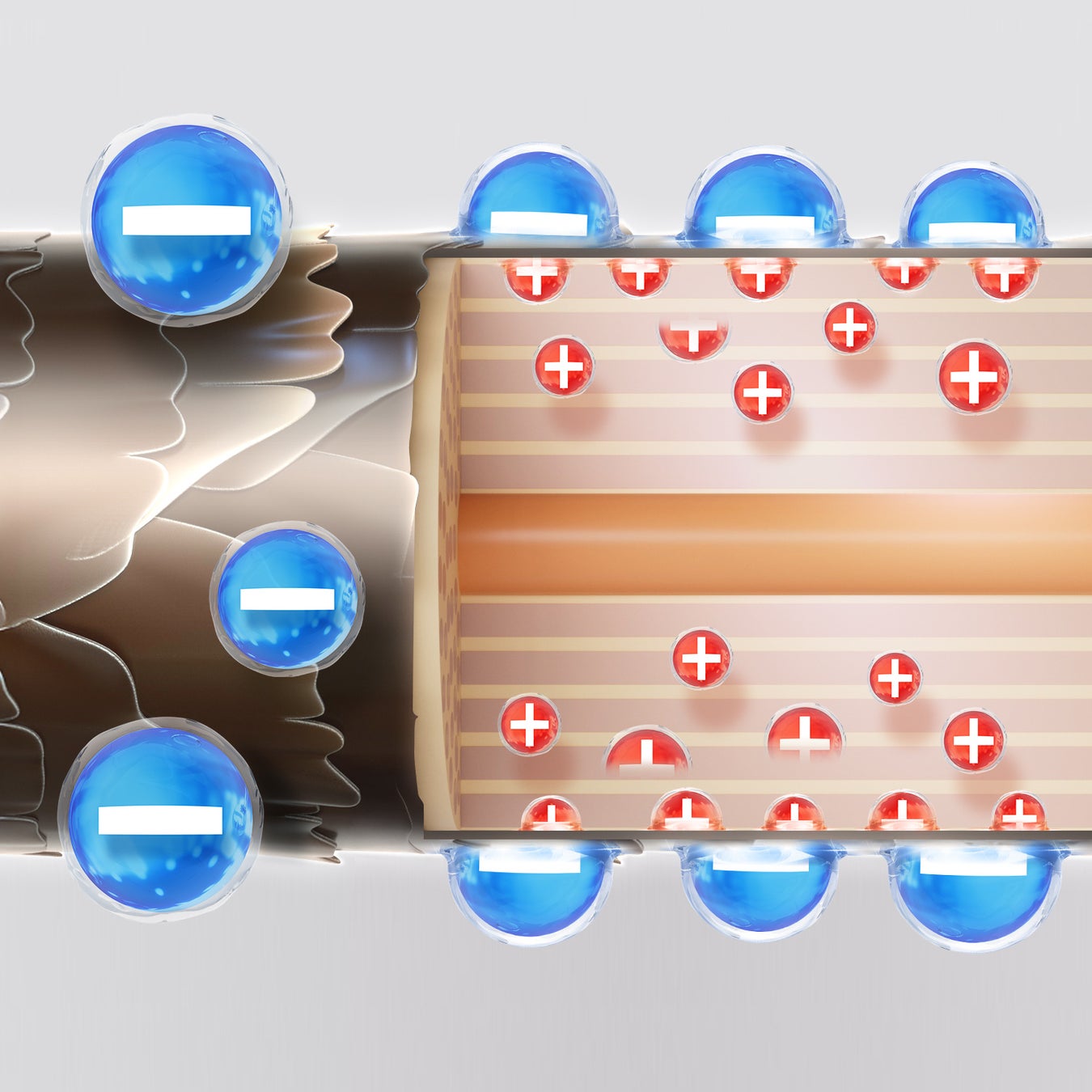 プラスイオンとマイナスイオンのケラチンが磁石のように強く引き合ってコーティング