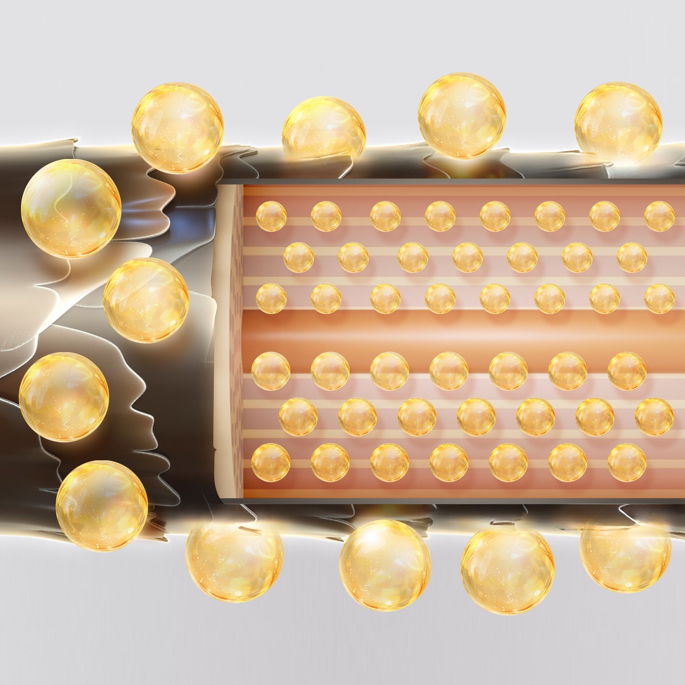 キューティクルの隙間よりも小さなケラチンが内部の空洞を埋め、髪内部には物理的に入り込めない大きなケラチンが表面を擬似キューティクル層のようにカバー。