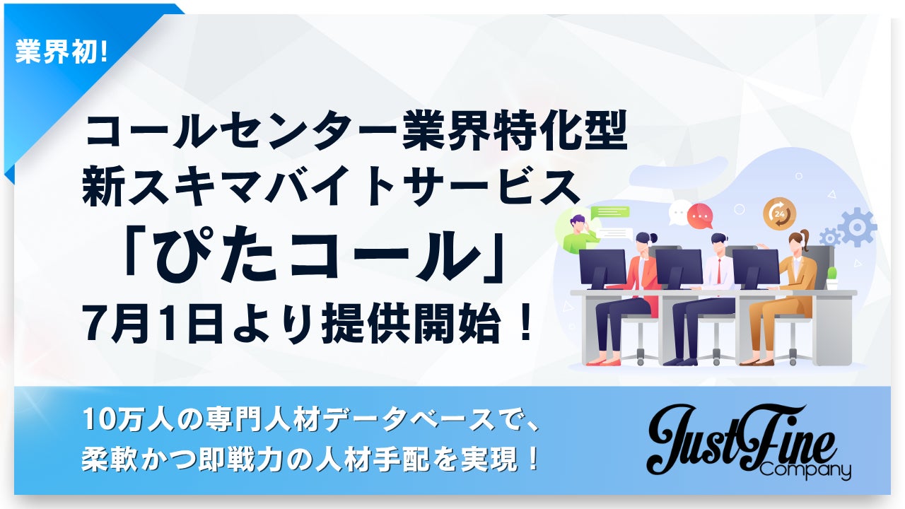 コールセンターに特化した人材派遣会社、株式会社ジャストファイン(本社:東京都新宿区、代表取締役:平島 孝則)は、業界初となるコールセンターに特化したスキマバイトマッチングサービス「ぴたコール」を、2025年7月1日より提供開始しました。
