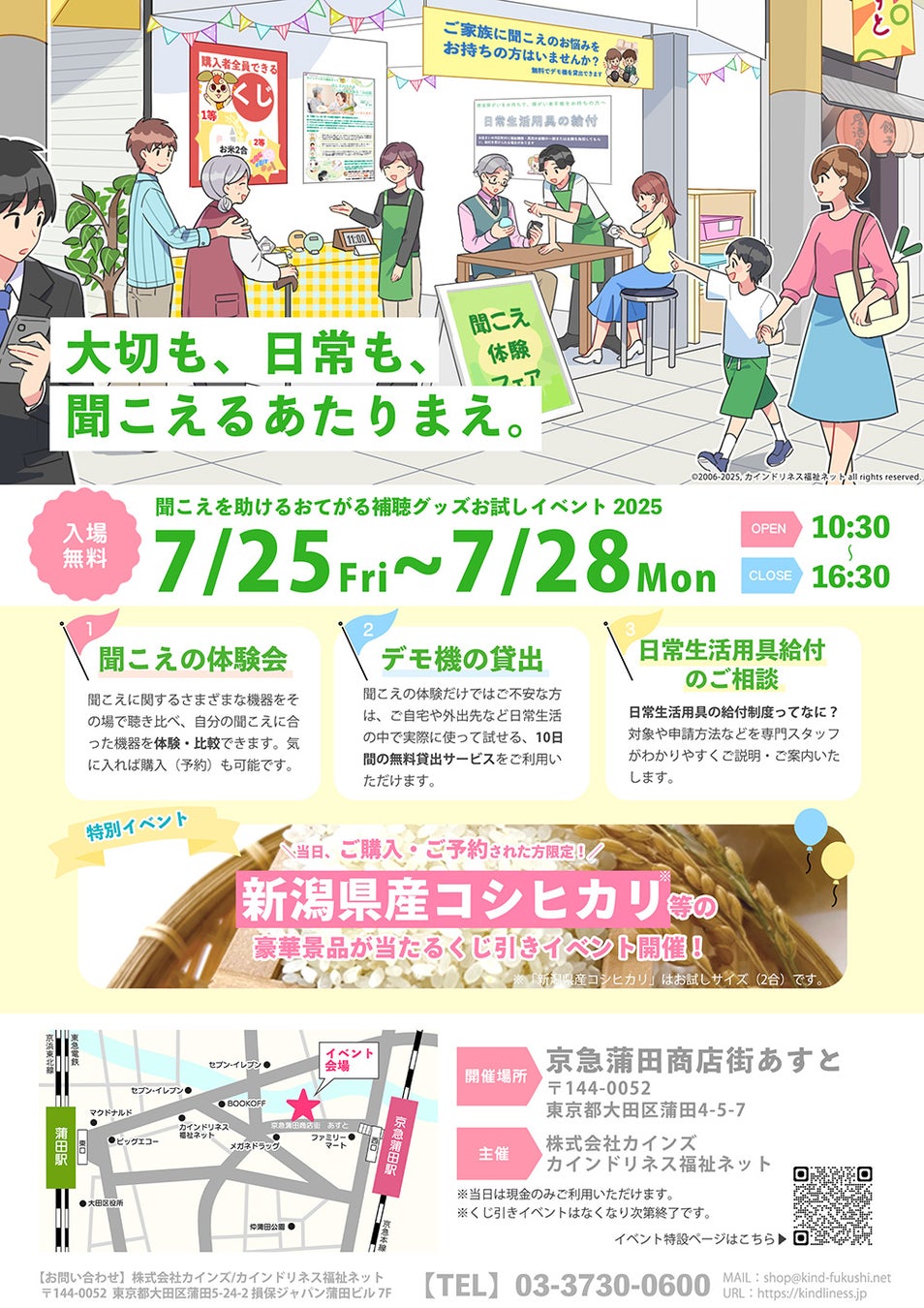 開催期間は2025年7月25日(金)〜28日(月)の4日間、会場は東京都大田区蒲田の『京急蒲田あすと商店街』です。集音器をはじめとする福祉機器を手に取り、無料で体験できるイベントは都内でも珍しく、当日はその場での購入のほか、日常生活用具給付申請の相談や見積もりも可能です。